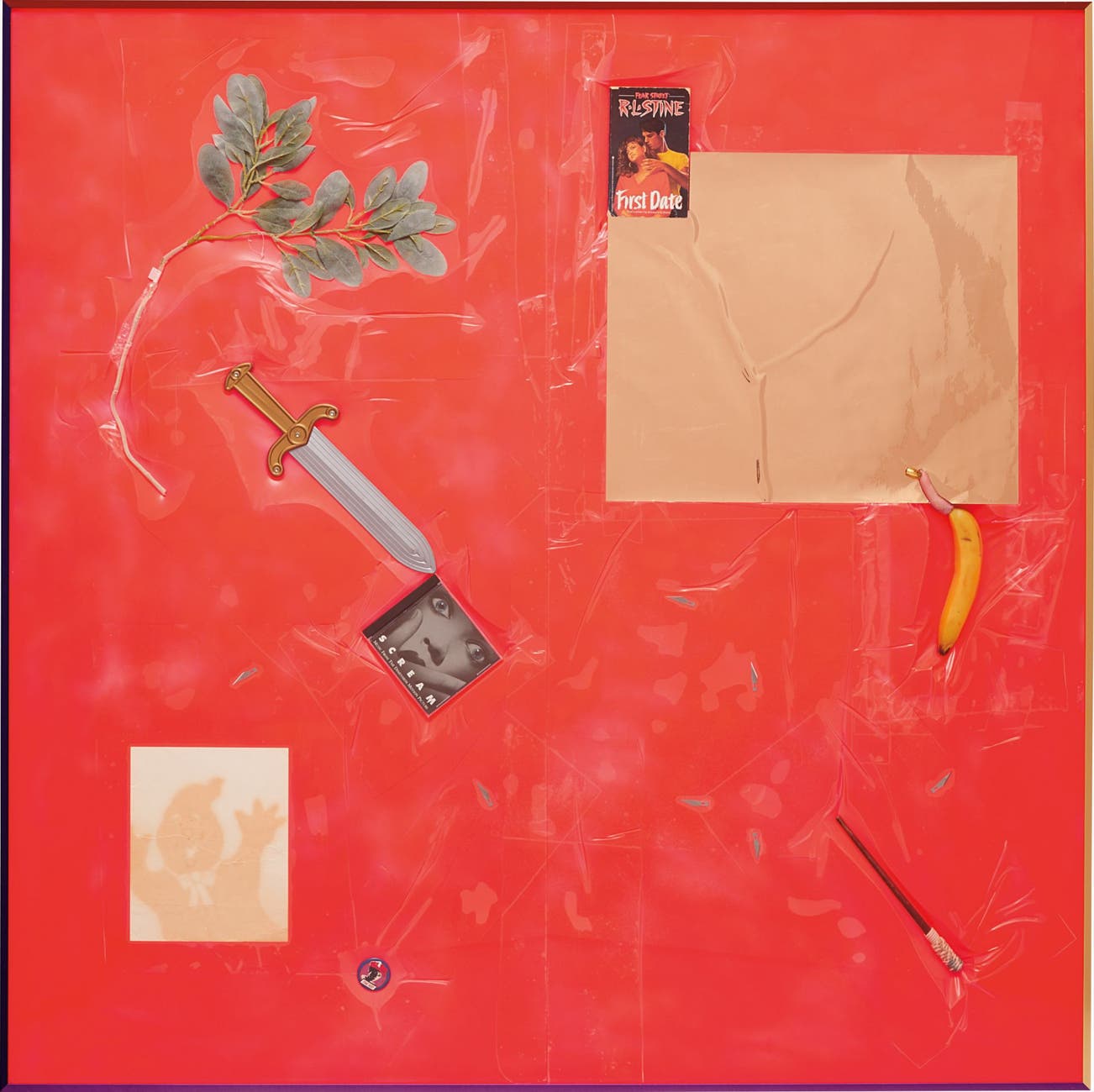 foam, flocked plastic sage, plastic sword, Scream Motion Picture Soundtrack CD, gold mirror film, rubber banana, rubber finer, artificial chrome plated fingernail, R. L . Stine’s First Date, Luren Jenison’s homemade magic wand, razor blades, Dick Tracy button, spray paint, plastic sheeting, stained cardboard, in artist's frame