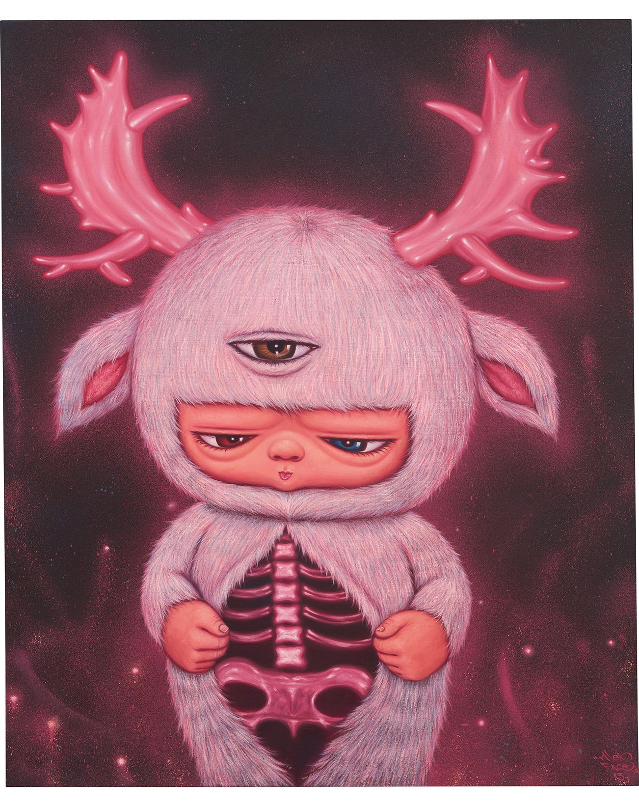 Executed in 2014, Love-Peace is a captivating example from Alex Face’s notable oeuvre. In glowy shades of soft lavender, rosy pink and deep magenta, Mardi appears to almost illuminate off the canvas surface itself. The background has an almost other-worldly feel to it, composed of splattered paint that distinctively contrasts the more precise, multilayered brush strokes used to fashion the child’s fuzzy outfit. Showcasing both his formal training in architecture, and his street-art techniques, it is this intriguing blend that has contributed to the artist’s unique edge. Although Mardi’s small hands pull back at her costume to reveal a somewhat sinister skeleton beneath, the title Love-Peace offers a more hopeful reading, reflecting a sense of the world we should all aim to achieve.