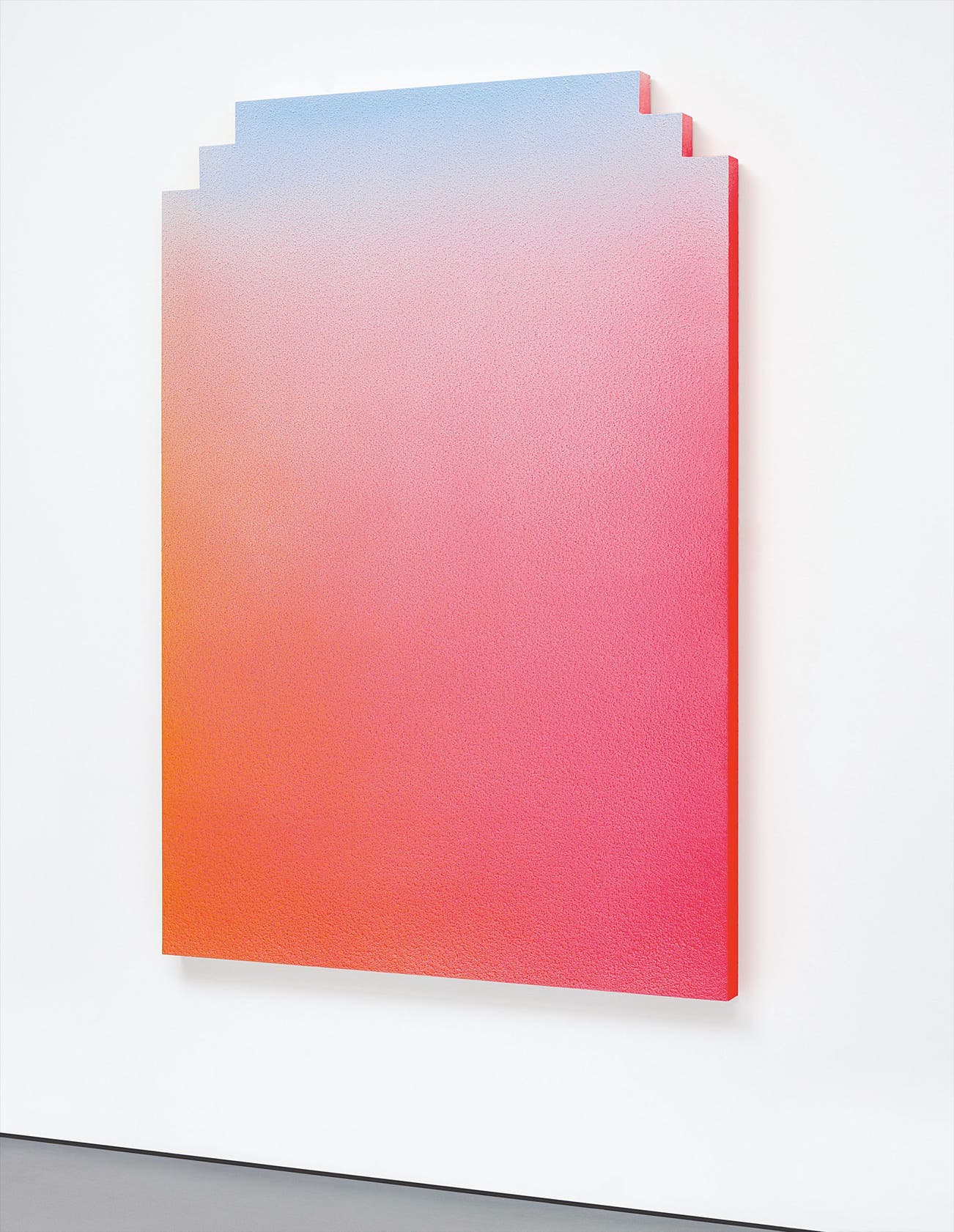 For Los Angeles born artist Alex Israel, 'Hollywood is not simply a town, but also an attitude and a way of moving and being.' His series of Flats are intended to evoke the experience of ‘Hollywooding’, a term used by the artist to describe the unique character of the city. Each of the Flats is stuccoed and painted with dusky shades of pink, orange, red and violet. Although they hang on the wall, Israel deliberately avoids referring to them as paintings, rather, he defines them as ’flats’, a technical term used in the film and television industry to describe backdrops for sets. This terminology implies the hierarchical relationship between background and foreground; stage and action. These works are implicitly, therefore, only a stage set for the performance of objects or actors. Israel further explored this relationship in his exhibition Property (2011) for which he rented a number of cinema props, which staged his Flats. The Flats, therefore, clearly evoke notions of staging and performance which are essential to his idea of ‘Hollywooding’. They also refer to his beloved city architecturally: they evoke the Spanish Colonial Revival Style prevalent across Southern California. This architectural style was in vogue in Hollywood’s Golden Age, with architects such as Wallace Neff and George Washington Smith creating this distinctive technique. The arches used by Israel in his Flats clearly reference the windows and doors of this Hispanic style, adding a further layer to the notion of framing a scene.