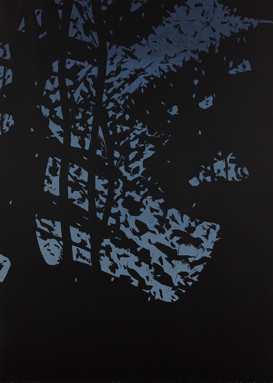 Linocut and monotype in colors, on Rives BFK paper, the full sheet.