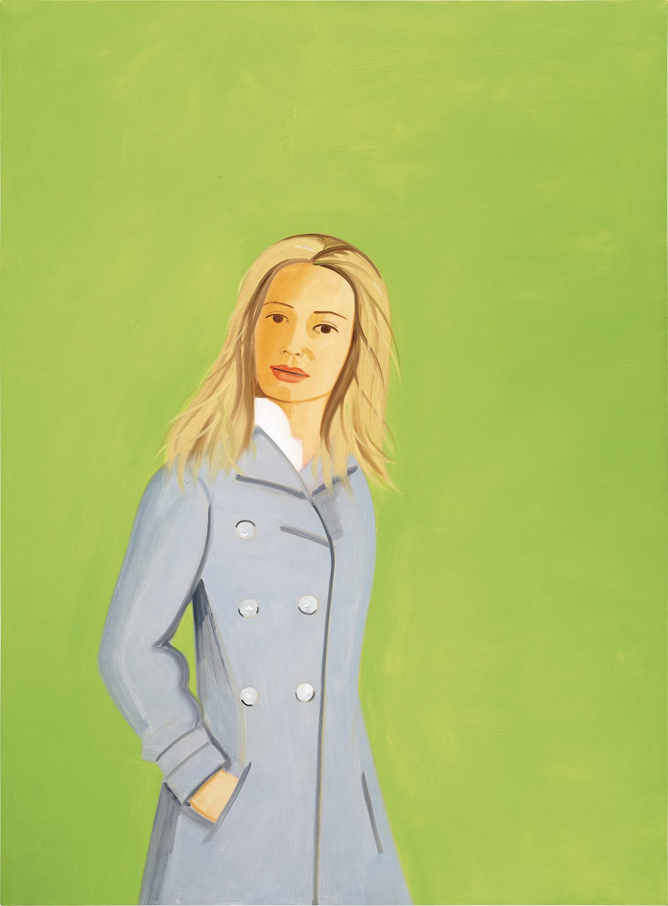 The present work was unveiled as part of a larger group of pieces that radiated a new sense of energy displayed by the artist in the mid-2000s, painted in bold colours such as pinks and blues, and in particular the lime green of Leigh. In this work, the titular blonde character dons a trench coat with her hands in her pockets, and faces the viewer in the middle of the canvas with a relaxed half-smile so typical of Katz. Against this luminous green field, the subject of the painting becomes the focal point of the work: an intense form of figuration as imagined by the artist. Having previously named Goya amongst key painters influential to his mode of painting, it is perhaps possible to detect in Katz’s work a contemporary rendition of the portraiture for which the 19th century artist was famous. In its minimalist and luminous execution, Leigh is devoid of sentimental attachment and yet capable of communicating a potent and profound psychological connection with its audience. Similar to Goya then perhaps is Katz’s attention not only to the inner monologue conveyed by their models, but utilising cropping and confinement of canvas in order to evoke certain sentiments.