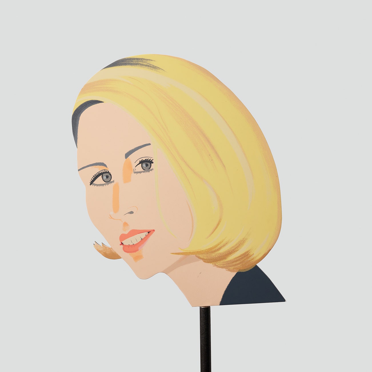 Shaped aluminum multiple with screenprint in colors on both sides, with a bronze stand and base.