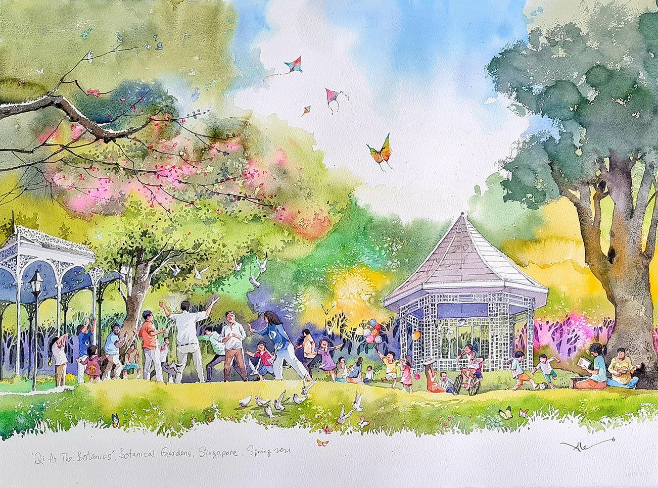 In this watercolour painting, Alex Leong (b. 1969, Malaysia) adeptly captures a vibrant scene of the Singapore Botanic Gardens. The precise brushwork and elegant details bring to life the beautiful spirit of families enjoying their time together, away from the hustle and bustle of the city.