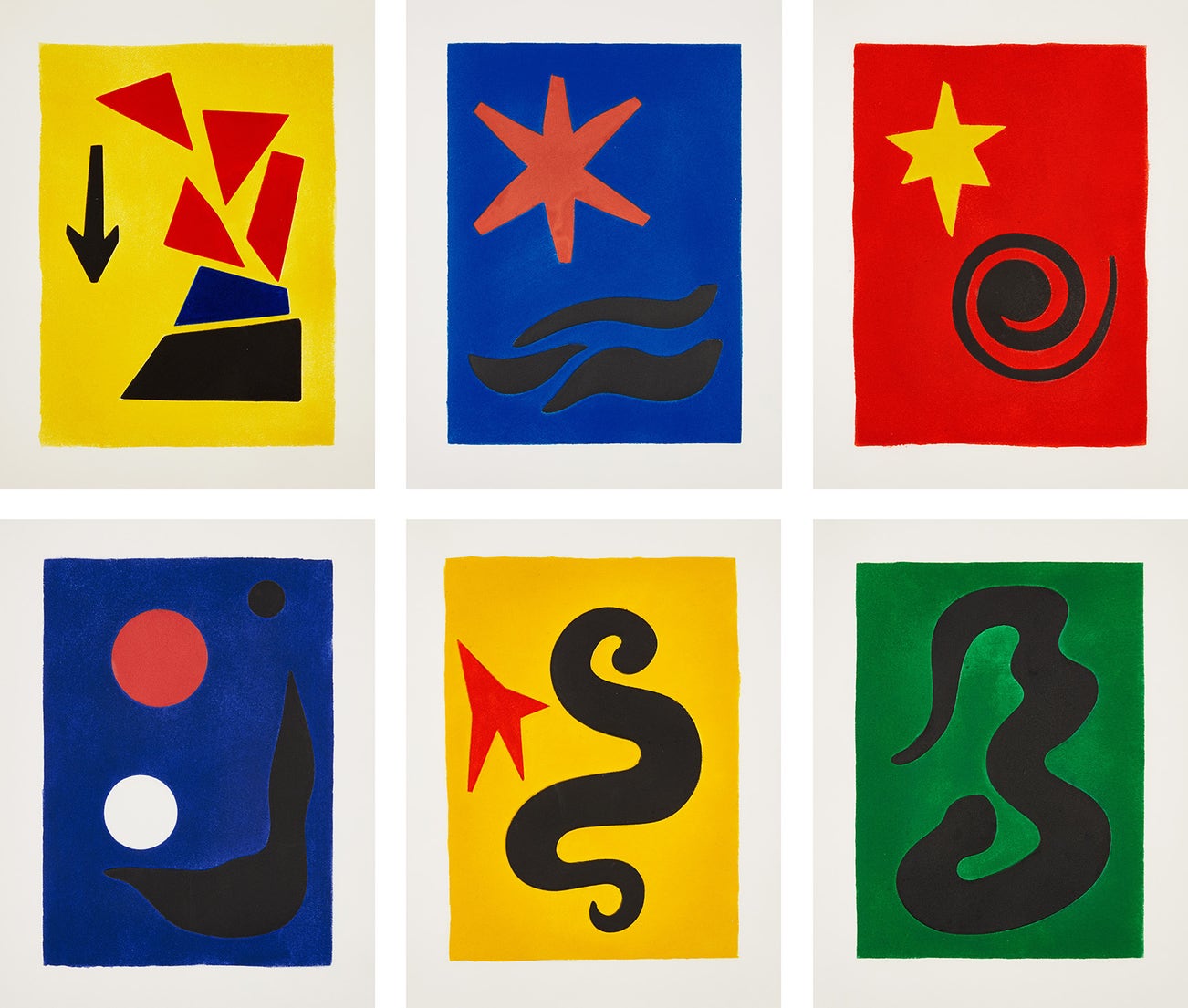 The complete set of seven etchings plus the cover in colors, on Arches paper, loose and folded (as issued), with title page and text by Jacques Prèvert, contained in the original red linen-covered portfolio.