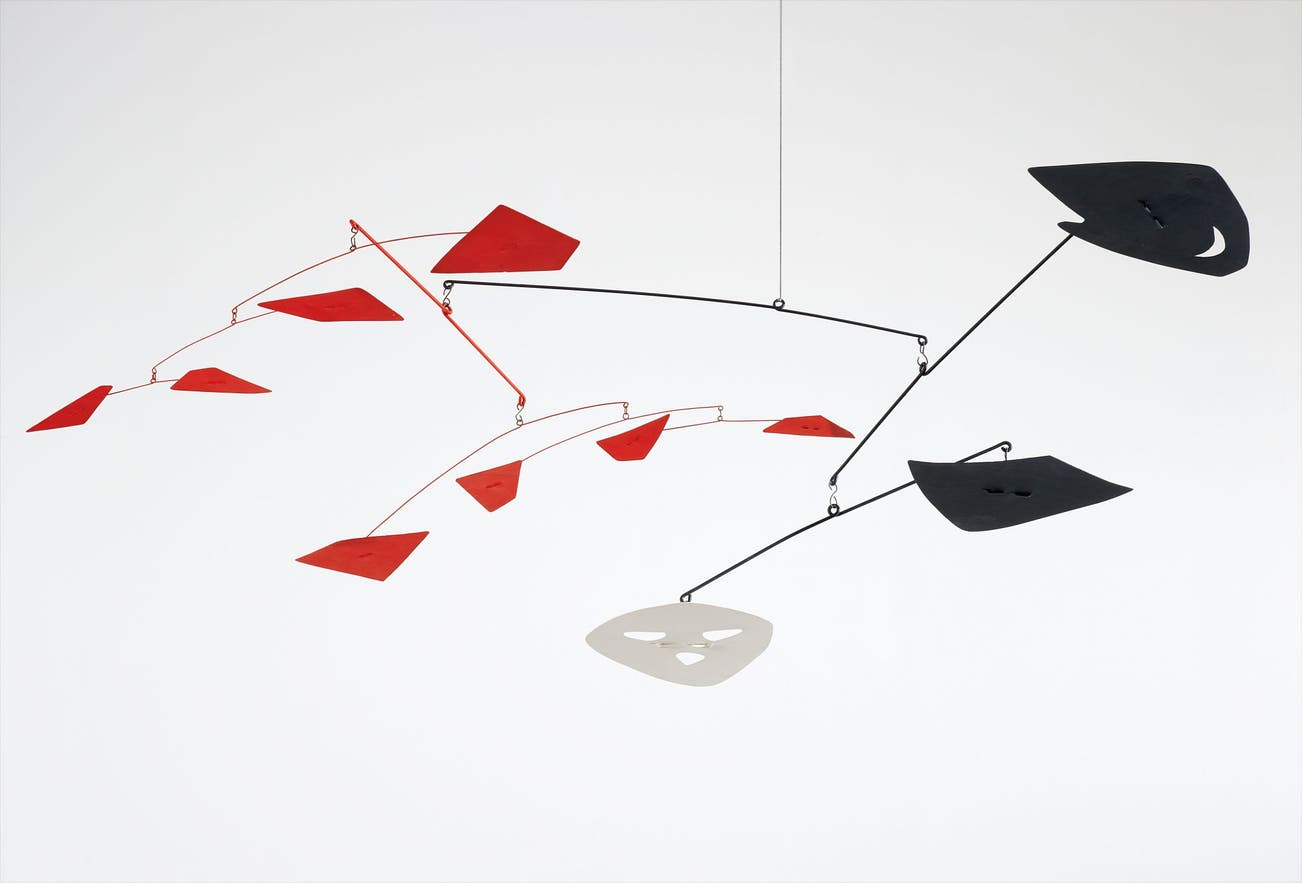 height of his powers. Hanging from a single focus point, the present lot is a tri-chromatic assemblage of the shapes of Calder’s past. Two groupings of rival weights are positioned opposite each other, each allied in perfectly equaled strength against the other. Though they could easily change orientation from the perspective of the observer with an easy breeze or a slight touch of the hand, the black discs of painted sheet metal loom larger than their glowing crimson counterparts. The two