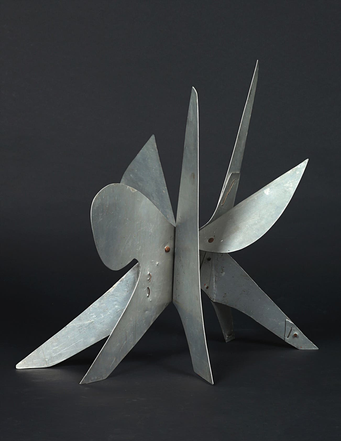 In 1960, the artist declared the importance of his monumental stabiles: “There has been an aggrandisement in my work. It’s true that I’ve more or less retired from the mobiles. I regard them as just fiddling. The engineering on the big objects is important” (A. Calder, quoted in M. Prather, Alexander Calder 1898-1976, exh. cat., Washington, D.C., 1998, p. 279). Using smaller sculptures as guides, such as the present lot, he was able to fluently complete his elevated, steel monuments; thus, while at a height of 17.5 inches, the maquette will forever insinuate its conversion to an immense scale. Calder develops the structure’s formal dualism by manifesting delicate forms with hard, industrial sheet metal. Though Calder predominantly rendered his maquettes in aluminium, here he chooses to use steel to create a durable, long-term structure: “Calder’s characteristic material is metal…He has always avoided modeling in favor of direct handling - cutting, shaping with a hammer, or assembling piece by piece. Such an approach has fostered a simplicity of form and clarity of contour in his work. It allies him with Brancusi, Arp, Moore and Giacometti in their repudiation of virtuosity” (J.J. Sweeney, Alexander Calder, exh. cat., New York 1951, reproduced in C. Giménez & A.S.C. Rower (eds.), Calder: Gravity and Grace, London, 2004, p. 72).