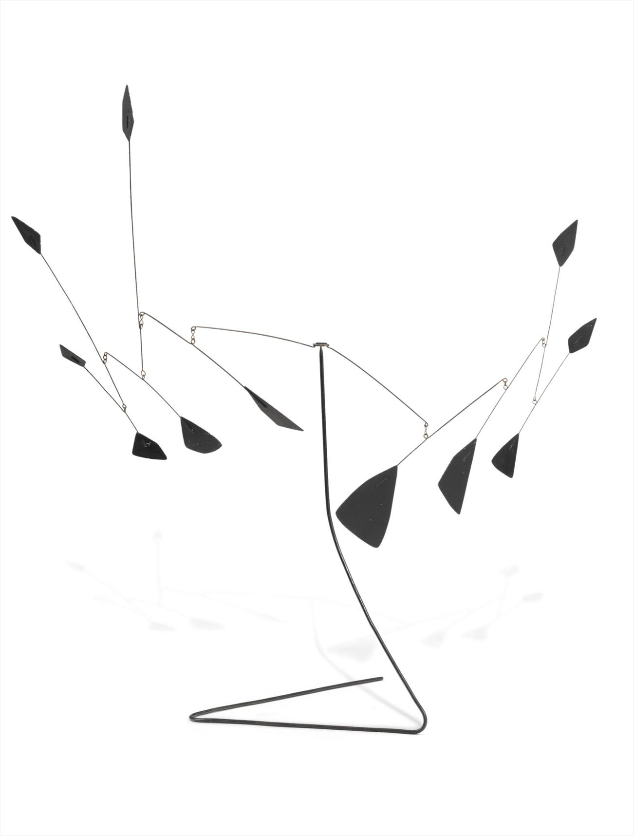Even though he explored a wide array of forms—colossal and slight, ground-mounted, adjourned and even a series of paintings—Calder’s first love as an artist was always the mutability of his subjects. Although during the post-war period, Calder concentrated on large-scale monuments for municipal plazas and corporate office centers, he continued to be absorbed by the possibilities that smaller-scale, more intimate works offered him. In the present lot, the viewer catches the artist at a pivotal point; the previous year he had represented the United States at the Venice Biennale where he secured the grand prize for sculpture.