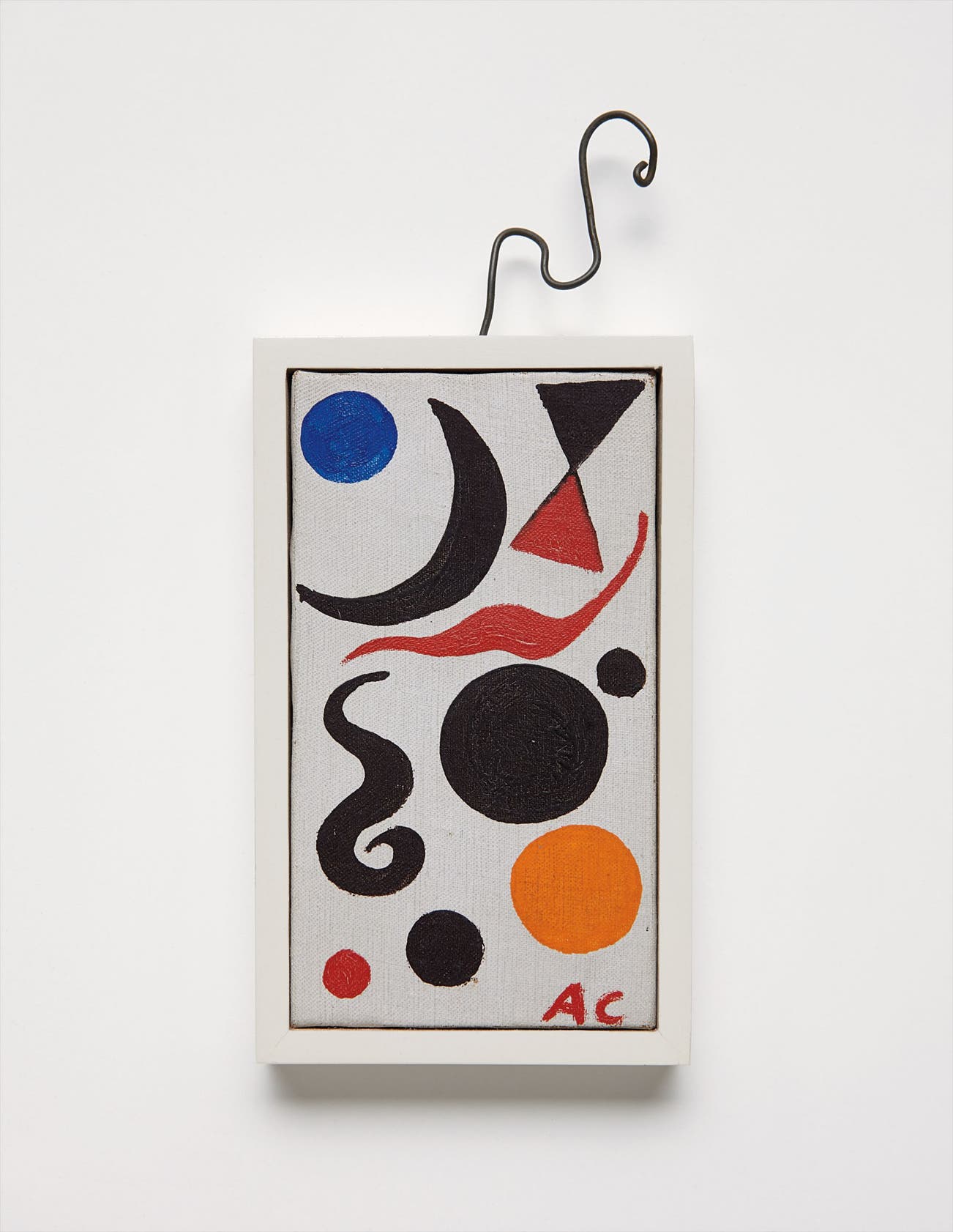 Presenting a unique assembly of both painted and sculptural elements, Composition with Blue Sphere demonstrates the way in which Alexander Calder’s distinguished style coheres with renewed vibrancy when employed across media. Calder’s celebrated sculptural practice has always resonated with the language of early abstract painting. His simplified, organic forms in saffron yellow, cobalt blue and vermilion red recall the early modernist aesthetics of Piet Mondrian. It comes as no surprise that Calder would himself turn to painting in order to cultivate his trademark style. When Calder began to paint in the early 1920s, he embarked on a two-dimensional practice that would continue to parallel the production of his famed “mobiles” and “stabiles” throughout his career. When he turned to canvas, he found himself able to translate the vocabulary of his large-scale sculptural practice to a far more intimate medium. Composition with Blue Sphere, with its enchanting size and graceful effect, demonstrates this refreshing immediacy.