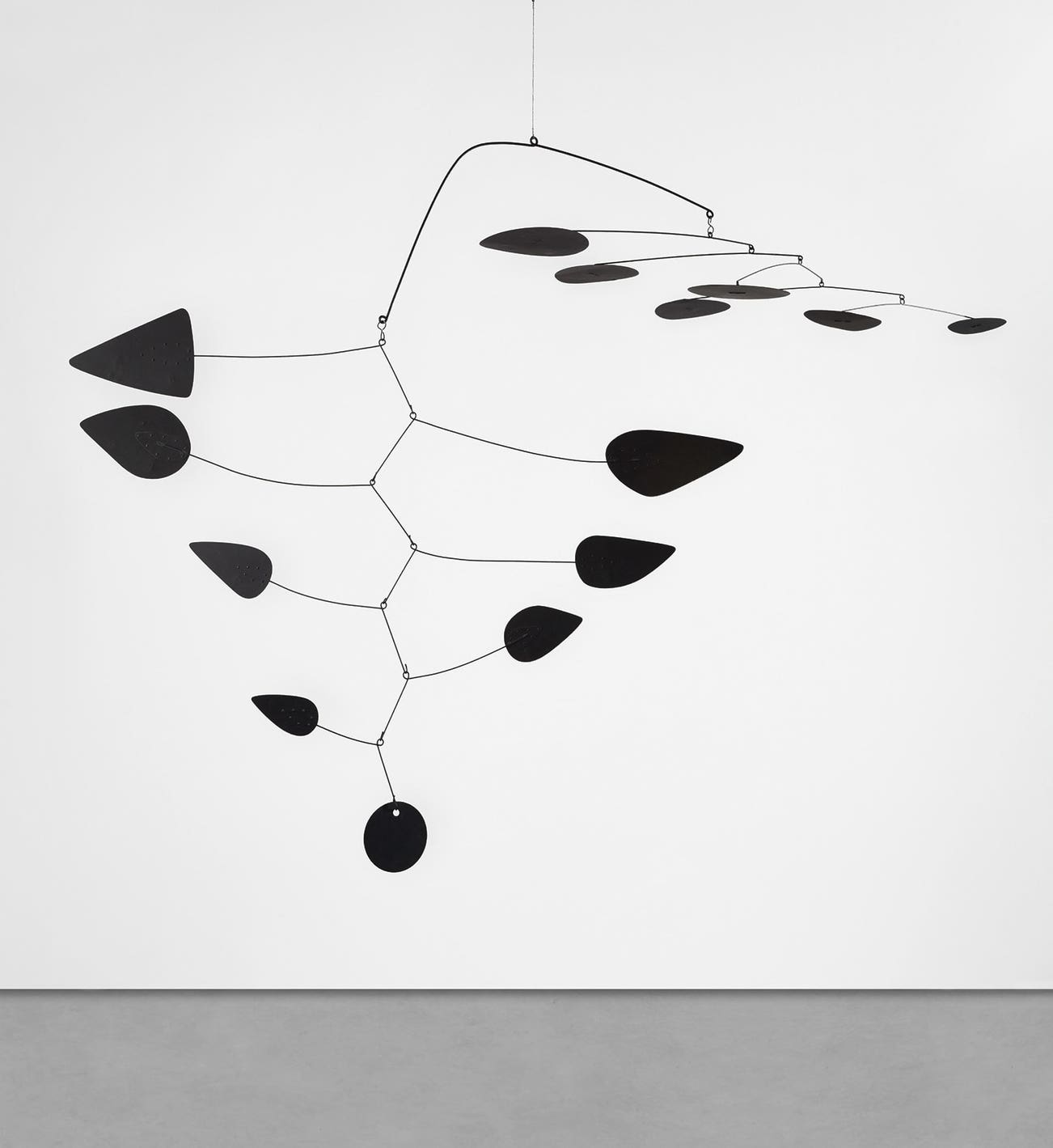 It was later that Calder began to confront the staid restraint with which artworks were displayed at the time. He started to present his standing works on the floor, rather than on pedestals, and in his hanging mobiles such as Black Gamma, he occupied the space suspended under the ceiling. This had formerly been the arena of painters such as Michelangelo, and seemingly not of sculptures, less so of those that move. Yet Black Gamma dominates the ceiling, with its constellation of black panels and its arms stretching out wider than a human is tall. Three years before Black Gamma was made, the author Michel Ragon wrote of Calder’s works in terms that clearly apply here: “A Calder is a sort of chandelier, which like all chandeliers hangs from the ceiling, but which, in contrast to other chandeliers, is not used as a light fixture, but as a perch on which to rest our dreams” (Michel Ragon, quoted in Jacob Baal-Teshuva, Alexander Calder 1898-1976, Cologne, 2002, p. 24).