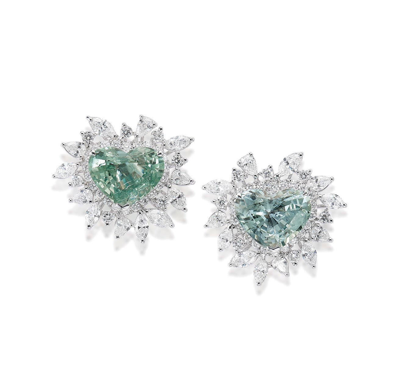 Two heart-shaped green sapphires, 7.87 and 6.56 carats respectivelyRound brilliant-cut, marquise- and pear-shaped diamonds18K white goldSigned <em>Laut </em>for Alexander Laut<em>GRS Report: Burma, no indication of thermal treatment</em>