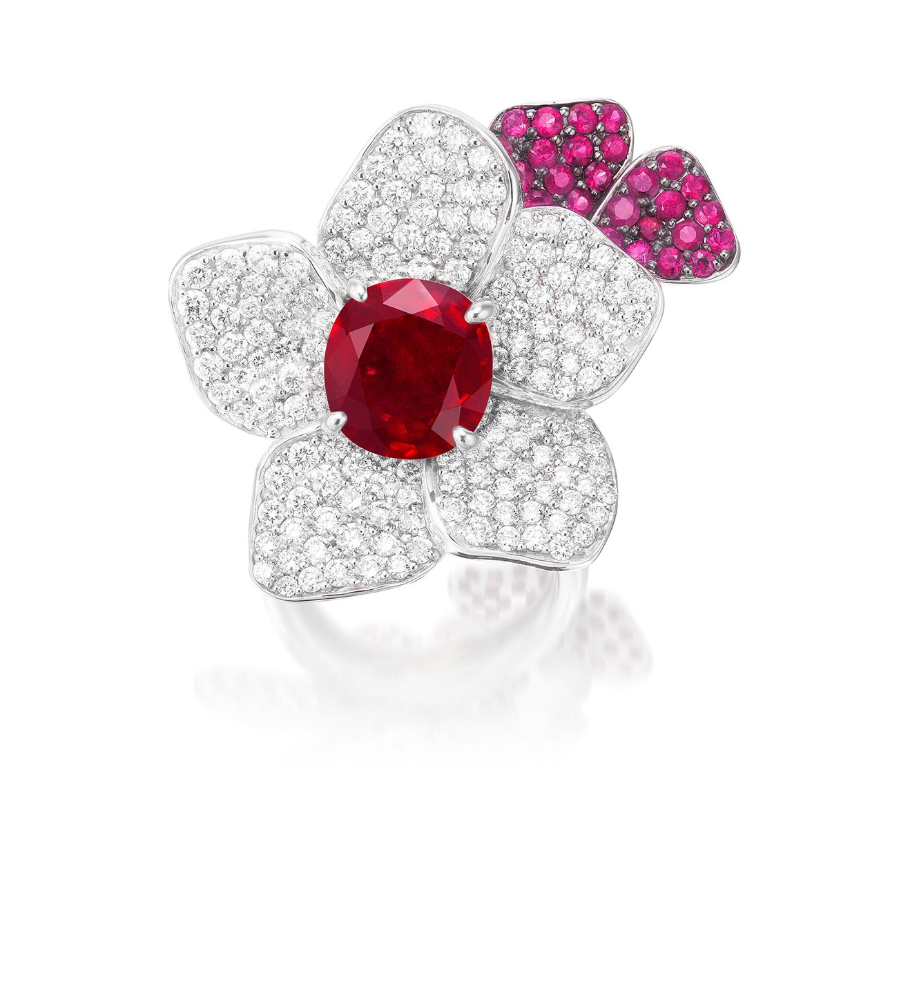 Designed as a flowerhead, set at the center with an oval ruby weighing approximately 3.19 carats, within a brilliant-cut diamond petals, further enhanced by circular-cut ruby leaves, mounted in platinum and oxidized white gold, size 6¼, signed Alexander Laut, numbered, with maker's mark.