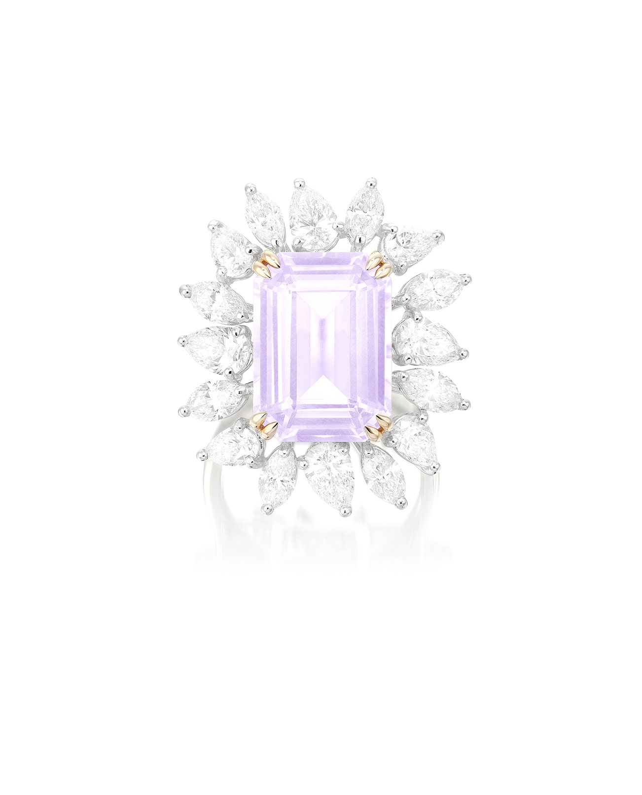 Set with an octagonal step-cut colour-change sapphire weighing approximately 10.60 carats, within a marquise and pear-shaped diamond surround, mounted in white gold and pink gold, size 6¼, signed Alexander Laut, numbered, maker’s mark.
