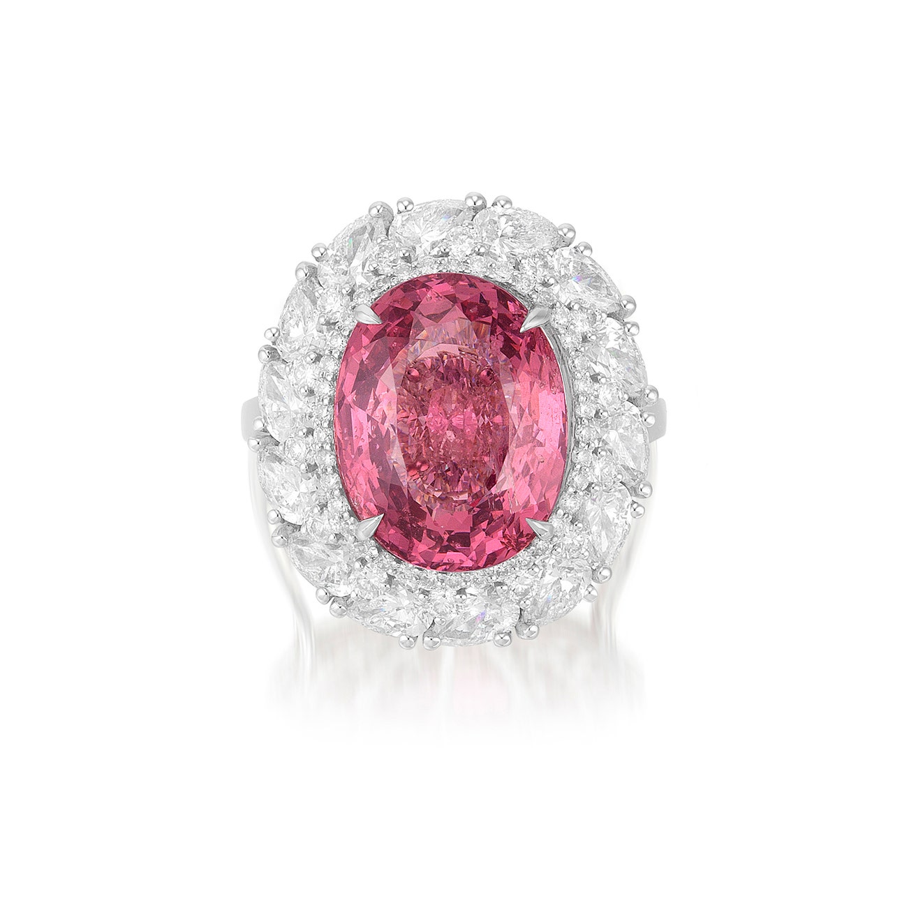 Set with an oval pink spinel weighing approximately 10.06 carats, enhanced by an oval diamond underneath, within a brilliant-cut and pear-shaped diamond surround, mounted in white gold, signed Alexander Laut, numbered, maker's mark, size 6¾.