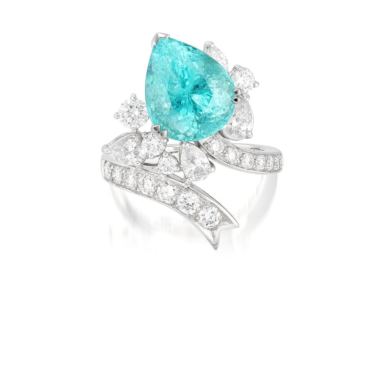 Set with a pear-shaped paraíba tourmaline weighing approximately 6.55 carats, accented by brilliant-cut and pear-shaped diamonds, mounted in white gold, signed Alexander Laut, numbered, size 7.