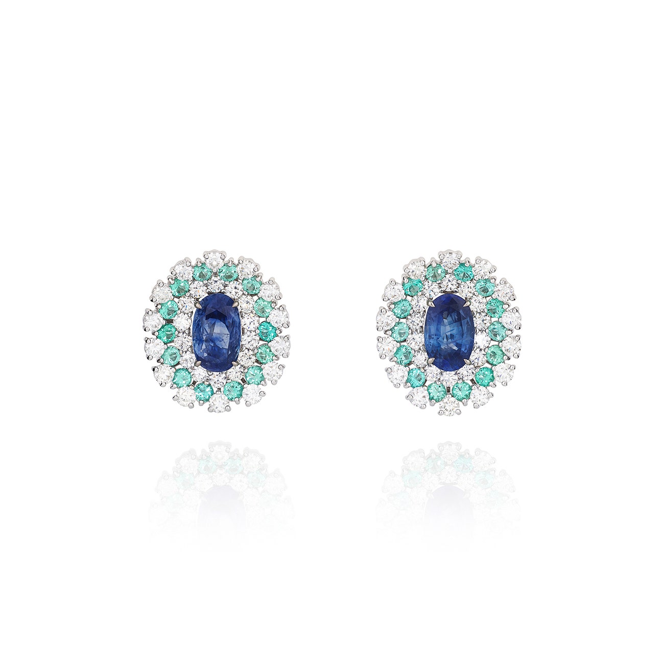 Each set with an oval sapphire weighing 4.82 and 4.31 carats respectively, within a halo of brilliant-cut diamonds and circular-cut emeralds, length approximately 26mm, one signed Alexander Laut, each numbered, post and butterfly fittings.