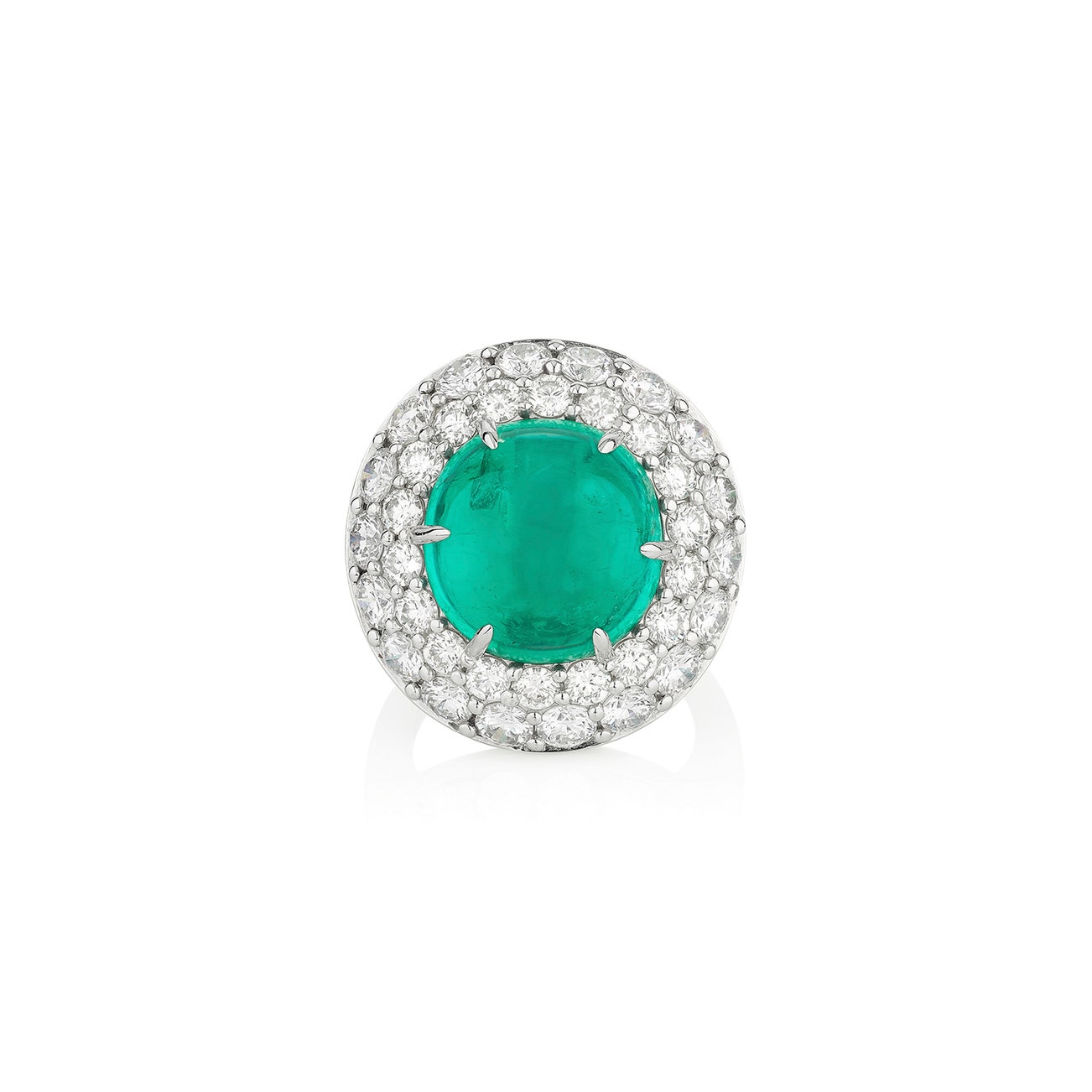 Set with an oval cabochon emerald weighing 10.82 carats, within a frame of brilliant-cut diamonds, size 54, Portuguese maker's mark for Alexander Laut and assay mark for platinum.