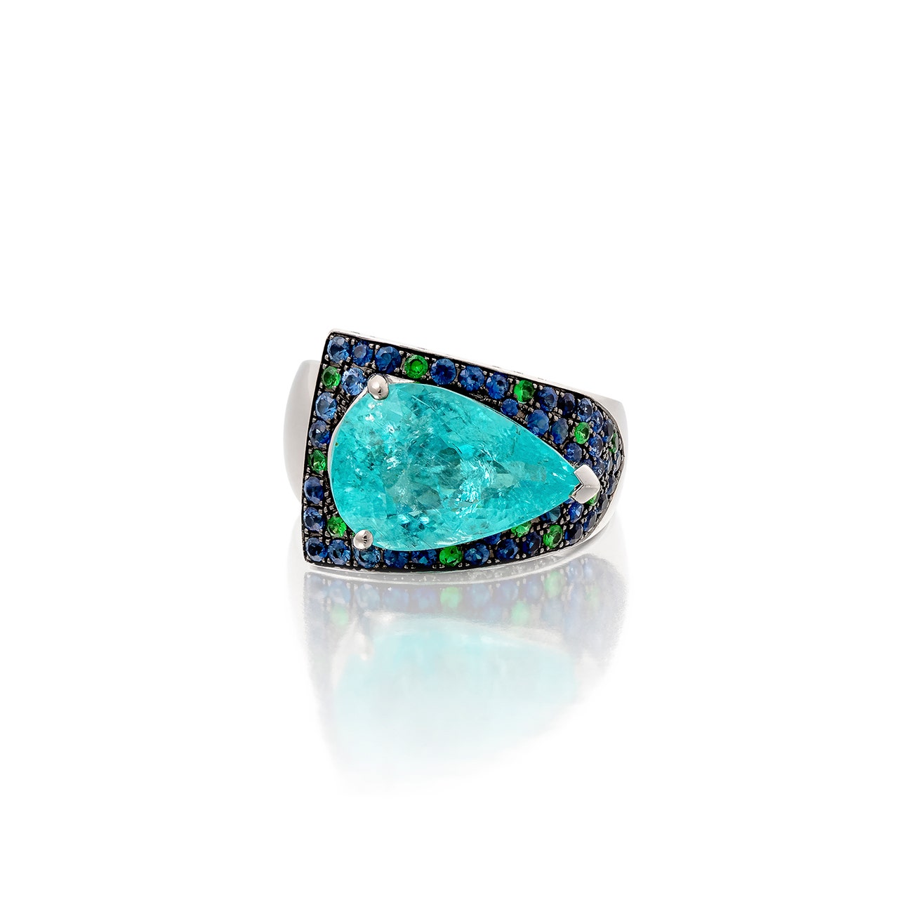 Set with a pear-shaped Paraiba Tourmaline weighing 7.94 carats, highlighted with circular-cut sapphires, tsavorite garnets, and brilliant-cut diamonds, size 55, signed Alexander Laut, numbered.