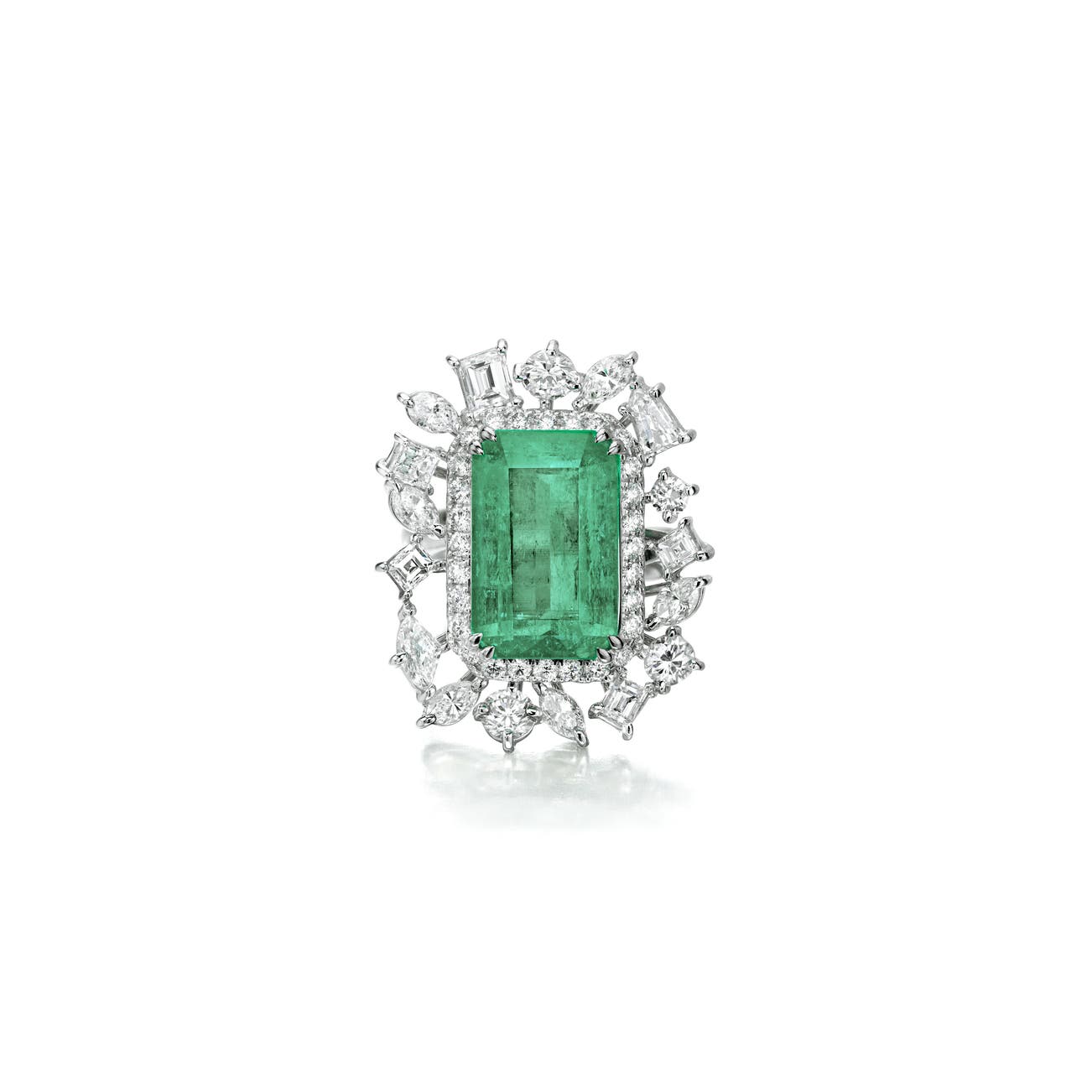 Set with a step-cut emerald weighing 11.36 carats, framed with marquise-, shield-shaped, step- and brilliant-cut diamonds, mounted in 18k white gold, signed Laut for Alexander Laut, numbered, size 6 1/2.