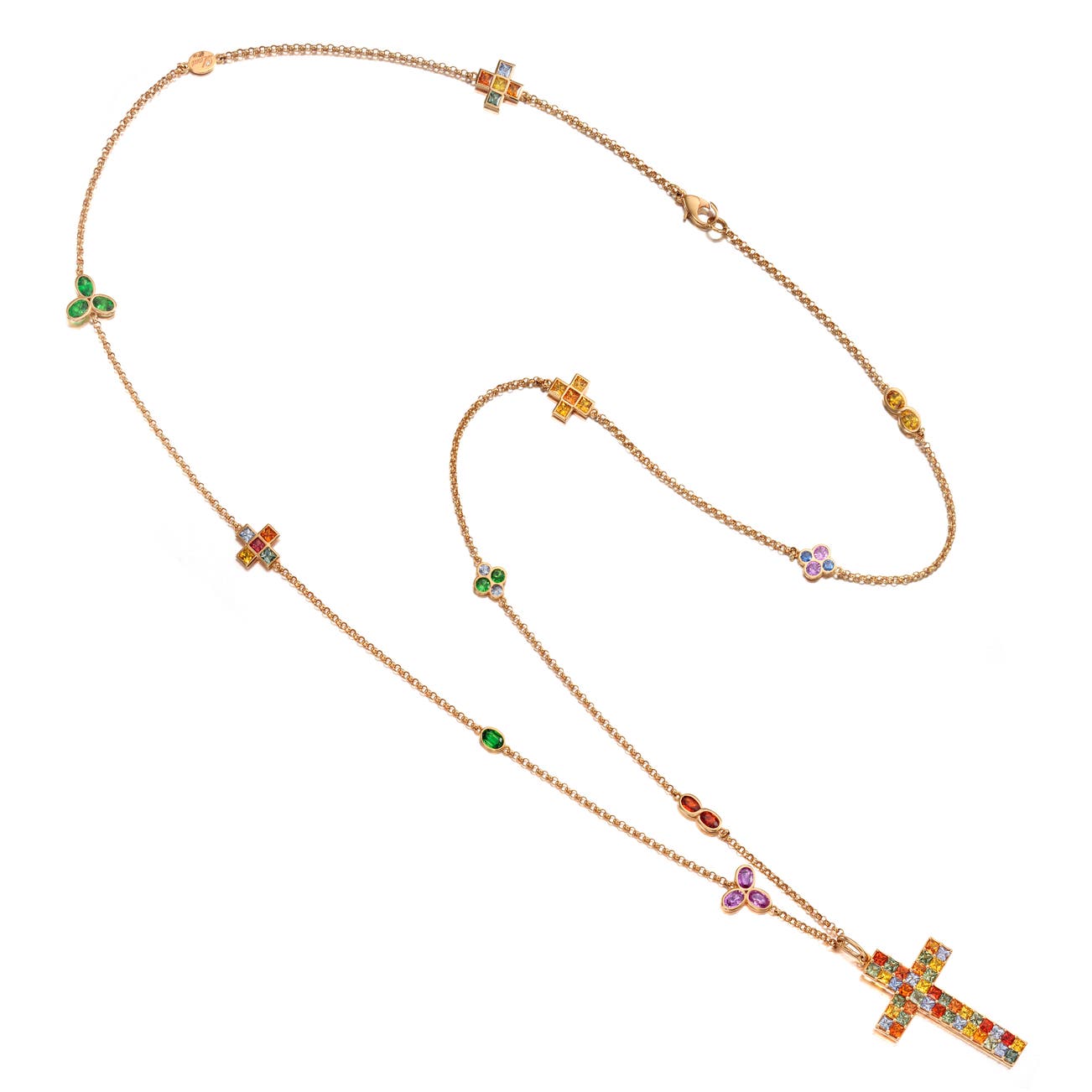 The pendent modelled as a cross, set with variously colored square-cut sapphires, measuring approximately 1 7/8 x 1 1/8 inches, suspended from a chain embellished with similarly colored oval-, circular- and square-cut sapphires and oval tsavorite garnets, length approximately 39 inches, mounted in 18k rose gold, signed Laut for Alexander Laut, numbered, Portuguese maker's mark for Alexander Laut and assay mark.