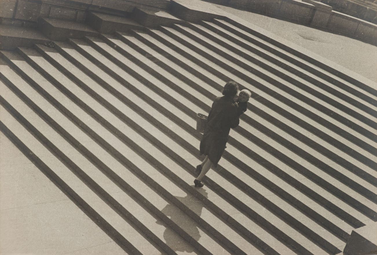 The large exhibition size print in the current lot entitled Steps, 1929, embodies Rodchenko’s manifesto. A classic example of a new way of seeing, it is shot employing his choice of a more interesting vantage point. Rigorously modernistic, the image is visually compelling – rhythmic lines glide elegantly at an angle while perfectly complementing the moving silhouette of the Madonna-like mother and baby. It was taken at the steps of Moscow’s 19th Century Orthodox Church of the Holy Saviour which was knocked down in 1931 to make way for the construction of the Palace of the Soviets, which unfortunately failed to be realised.