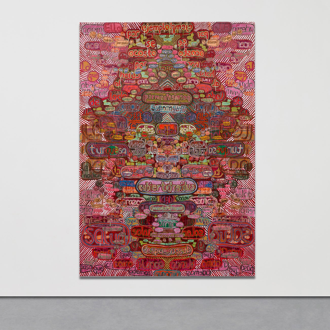 acrylic, acrylic ink and colored pencil on paper, mounted to fabric
