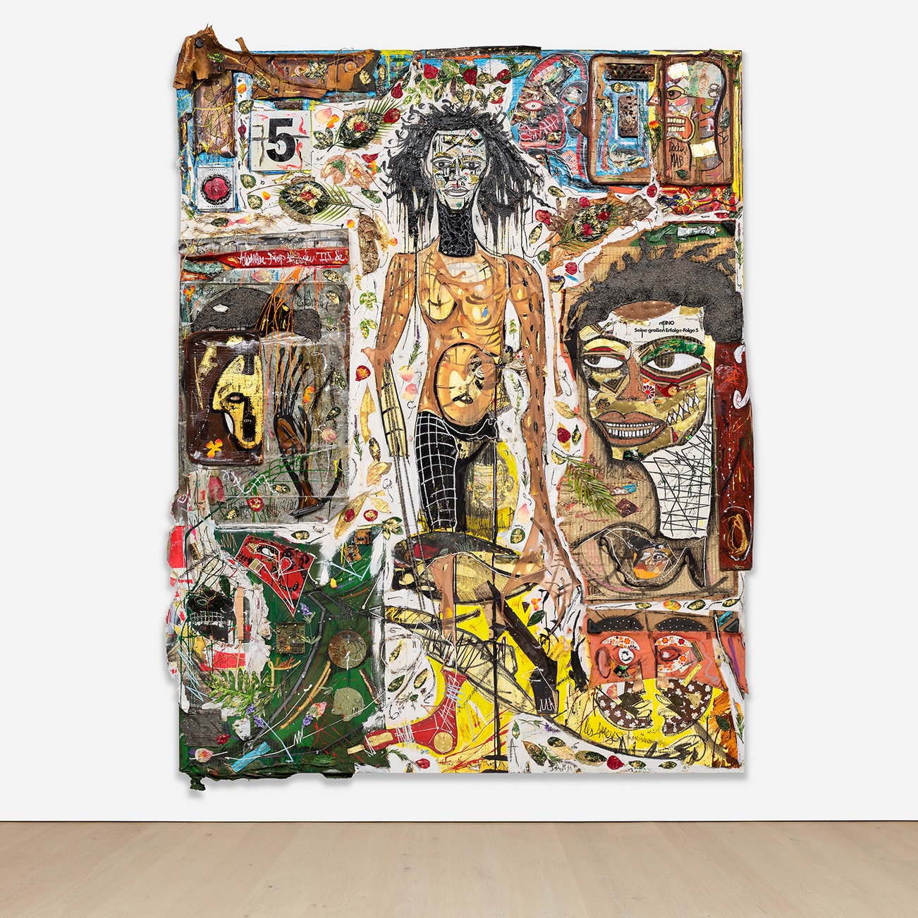 nails, staples, tacks, fabric, string, wire, thread, glitter, found metal, leather, plastic, canvas, wicker, paper, pastel, oil and acrylic on panel