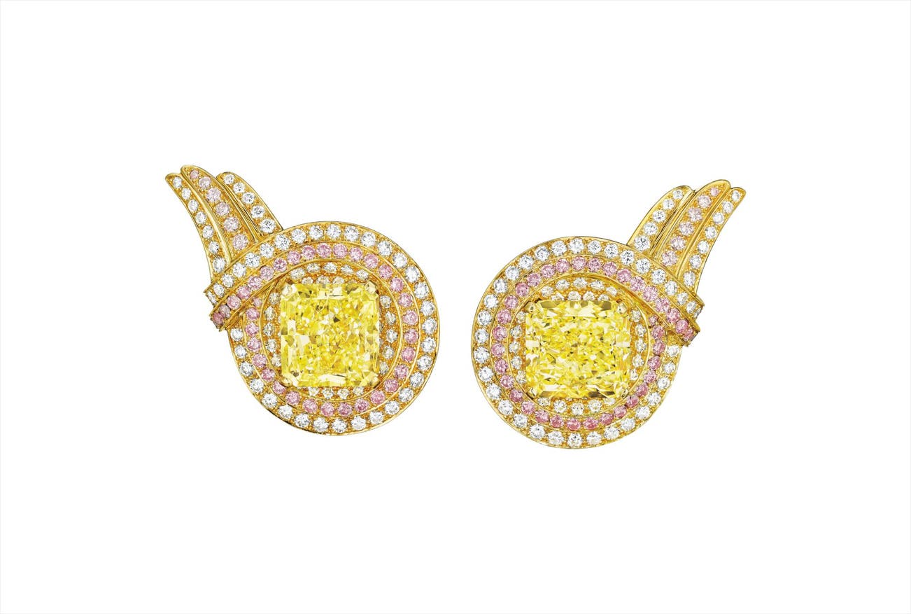 A Superb Pair of Fancy Yellow Diamond, Pink Diamond, and Diamond Earclips