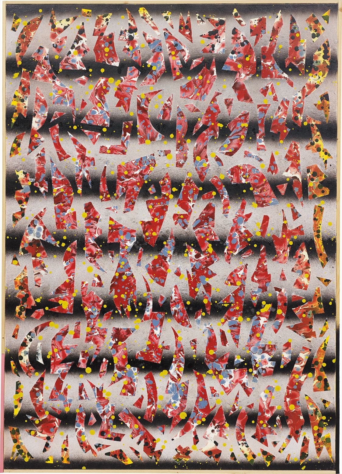 acrylic, glue-emulsion, spray paint, enamel varnish on canvas, in artist's painted wood frame