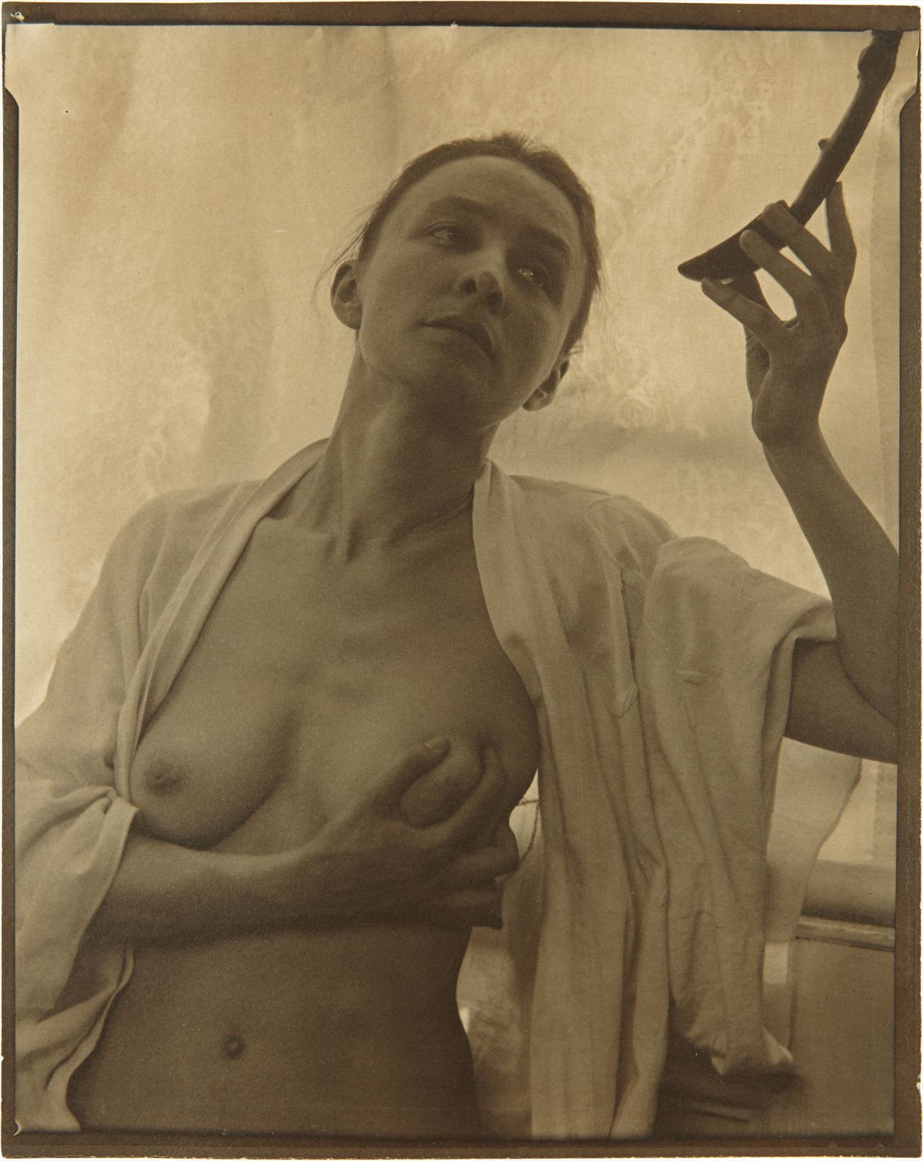 In June of 1918 Stieglitz left his wife of twenty-five years and moved with O’Keeffe into an apartment in Manhattan. It is in that small apartment that this rare and beautiful platinum palladium print was taken. Creating it was an act in which the photographer and the subject are “One in a real sense” - an artistic sense: He the director, she the embodiment of their primal passion. It is an “intensely sane” act full of wonder like “Nature itself.” Evocative planes of white, grey and black permeate the space infusing it with an other-worldliness. In one hand she holds a phallic-looking African spoon (exhibited by Stieglitz four years earlier at 291 and illustrated as pl. 45 in Greenough, Modern Art), with the other she clenches her breast. Towards the end of her life, O’Keeffe recalled those early photo sessions: “I was photographed with a kind of heat and excitement and in a way wondered what it was all about.” O’Keeffe gave the photograph that is being offered in the present lot to Doris Bry who