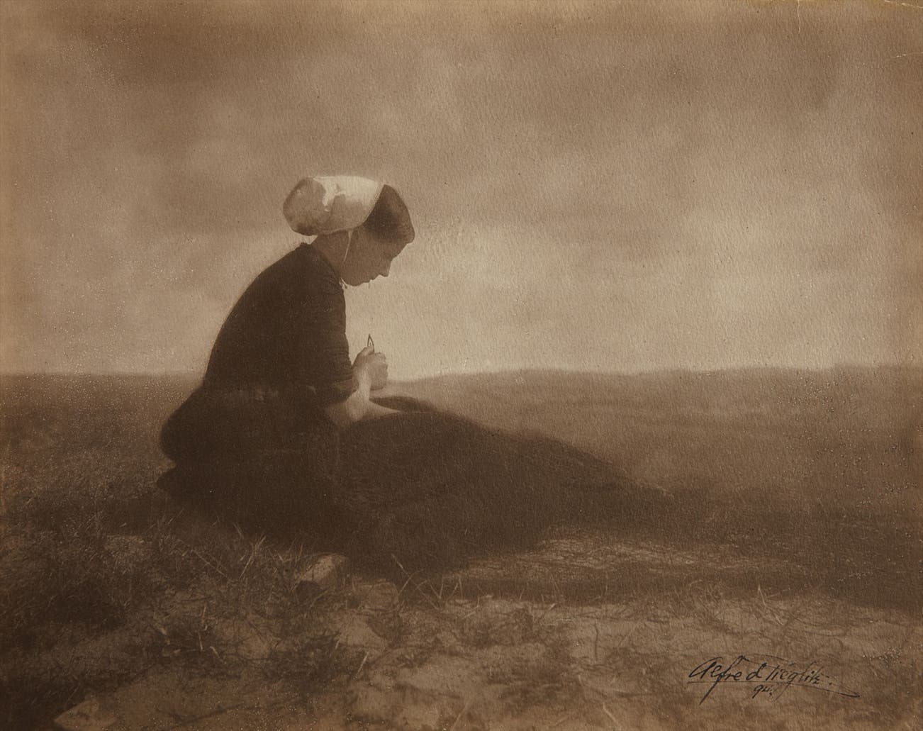 Isolated on a dune and poised against an infinite atmospheric backdrop, The Net Mender, is a late 19th-century meditation on what it is to be human. It is one of Alfred Stieglitz’s earliest masterpieces. Writing about The Net Mender in the 1899 article ‘My Favorite Picture’ Stieglitz said “It expresses the life of a young Dutch woman; every stitch in the mending of the fishing net, the very rudiment of her existence, brings forth a torrent of poetic thought in those who watch her sit there on the vast and seemingly endless dunes, toiling with a seriousness and peacefulness which is so characteristic of these sturdy people. All her hopes are concentrated in this occupation – it is her life.”