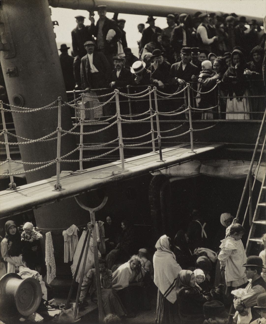 Stieglitz, himself the son of German-Jewish immigrants who had found success and wealth in America, photographed the scene of a departing ship, and its prominent low-cost or steerage class, while on board for Europe with his wife and child. Edgy and dissatisfied with his upper-level surroundings, he wandered the ship, eventually happening upon this view, which he photographed with his only available negative and a hand-held camera. Marked by the formerly-repudiated lynchpins of photography: clarity, linearity and tonality, The Steerage is entirely modernist in its composition. Gone is the central focal point that typified most Pictorialist photographs, replaced with the strong diagonal line which slices through the frame, causing a jarring bifurcation of the scenes unfolding. In a 1942 text titled “How The Steerage Happened,” Stieglitz described the photograph as a move into vanguard abstraction, but also to the heart of his soaring feelings for freedom in art and life itself: