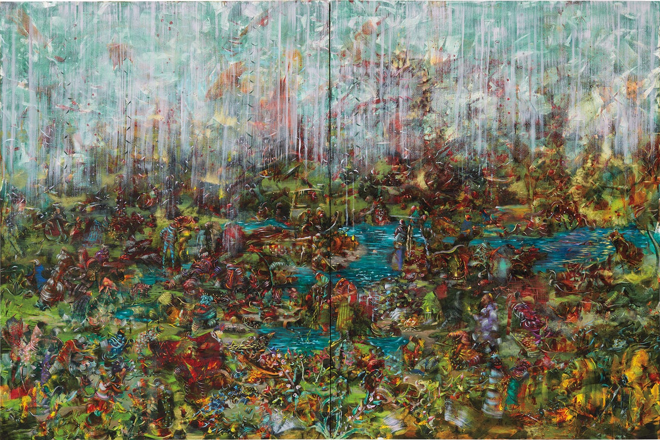 Banisadr’s experience of synaesthesia while painting allows him to transgress the limits of his senses, and construct magical worlds beyond the confines of realism. The rhythmic disarray of Banisadr’s exquisite works invites the viewers to wholly immerse themselves in these dramatic and unexplored states of flux. With its natural colours, elements and undulations of a rural landscape in combination with a kaleidoscopic frenzy of energetic, human-like movement, It Happened and It Never Did is a prime example of Banisadr’s unparalleled ability to create absolute balance. ‘It’s very important for me that there is no central focus. I want every single corner of the work to be as interesting as the rest. To have something to attract the eye. I don’t want any hierarchy’ (Ali Bandisadr, quoted in Graham Southern, Ali Banisadr: One Hundred and Twenty Five Paintings, London, 2015, p. 7).