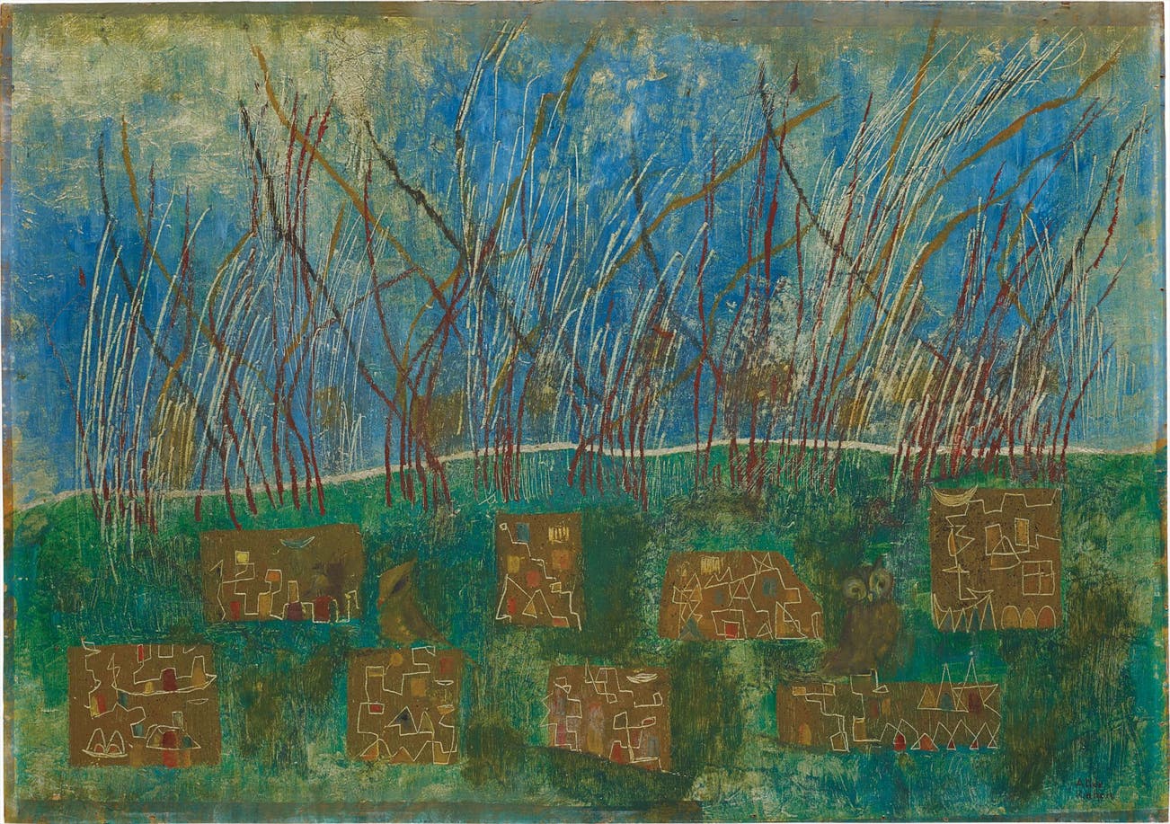 Signed "Alice Rahon" lower right; further signed and titled "Alice Rahon 'Los Guardianes' 'La chouette et le rossignol'" on the reverse.