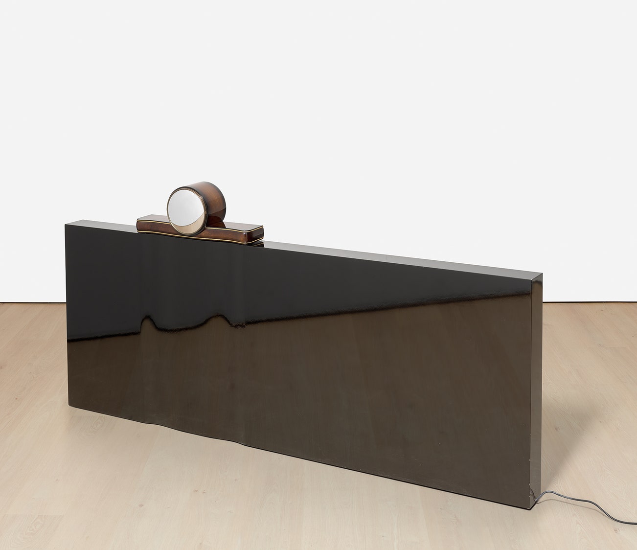 mechanic clockwork, mirrored-glass, glossy black MDF, microphone, mixer and speakers