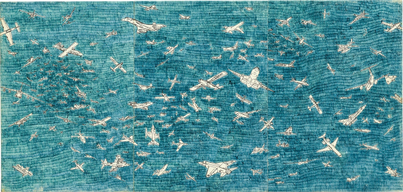 ballpoint pen on 3 adjoined sheets of paper mounted on canvas