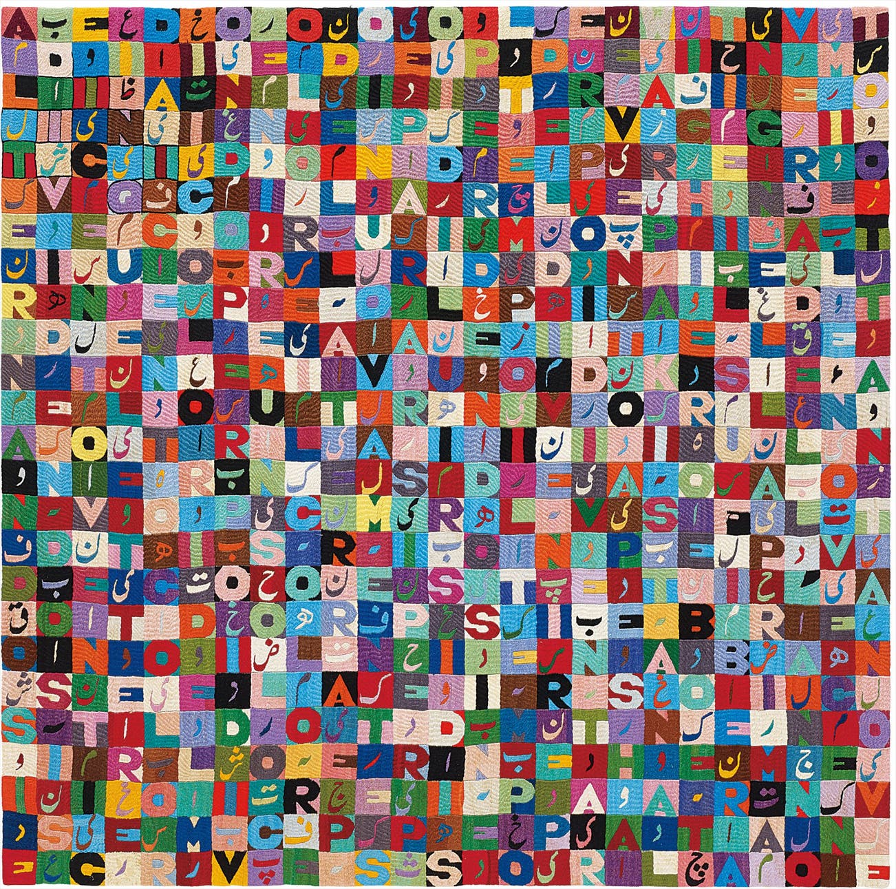 Alternandosi e Dividendosi, like most of Boetti’s mature works, searches for the inherent patterns and systems that give structure to everything around us. Here, two languages are broken up into their lowest common denominators. Just like the American Neo-Dada artist Jasper Johns who painted Alphabet works and number sequences, Boetti too by extracting individual letters takes them out of a context and in this manner denies them their ability to convey meaning or information. Thus, he imbues them with a new importance, demonstrating what they represent more broadly or exposing their inherent graphic forms for aesthetic scrutiny. For these reasons, Alternandosi e Dividendosi is fundamentally a visually striking and beautiful work of art whose powerful presence is only heightened through its scale and vivacity.