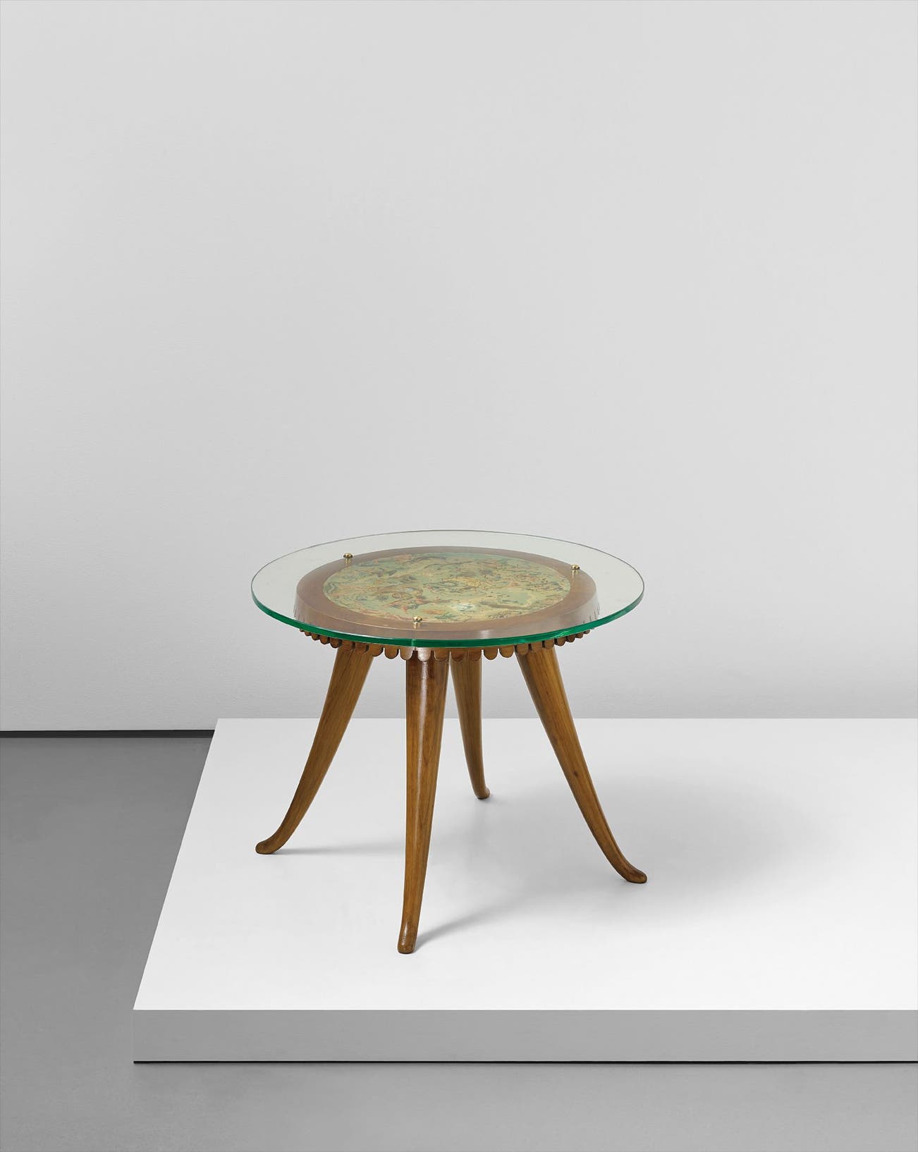 Stained walnut, painted wood, brass, glass.