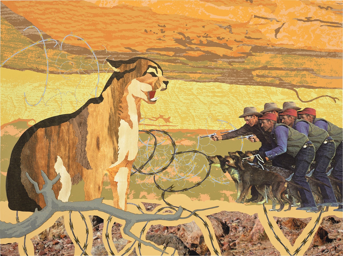 Screenprint and archival inkjet print in colors with laser cut wood veneer, collage, silver and gold leaf, on Coventry Rag paper, the full sheet.