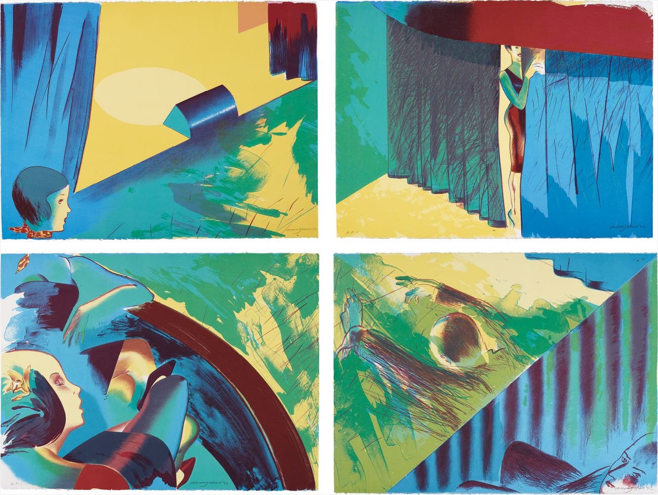 The four sheets are designed to be hung singly or in pairs, either horizontally or vertically, as well as together in one large composition.