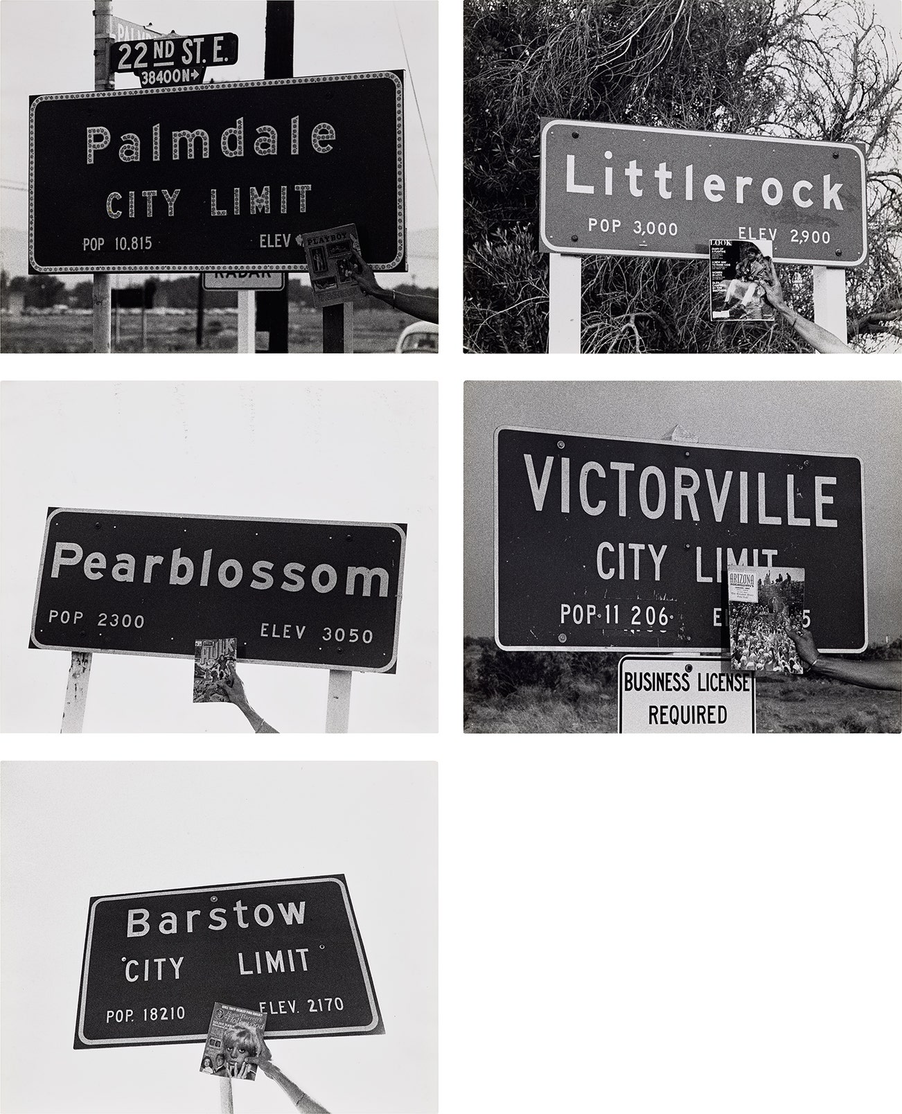 Executed early in his career, Untitled (City Limits) reflects the importance of language in pioneering conceptual artist Allen Ruppersberg’s practice along with contemporaries Ed Ruscha and John Baldessari. Each work depicts a snapshot of a city limit sign from small towns in California with a hand holding a magazine comically extending into the frame, interrupting the otherwise quiet scene. This juxtaposition and sequential arrangement of the series of five photographs induces the viewer to search for a narrative that extends across the works.