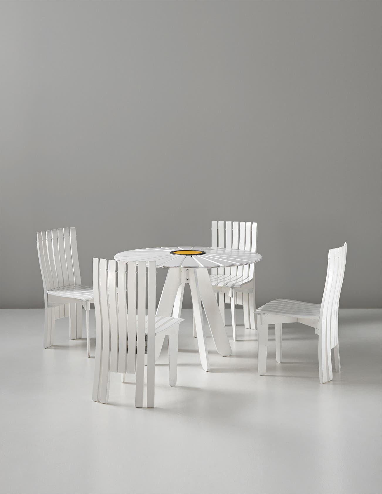 Early garden furniture set of four chairs, model no. 310, and a 'Sunflower' table, model no. 310, designed for the Villa Mairea, Noormarkku