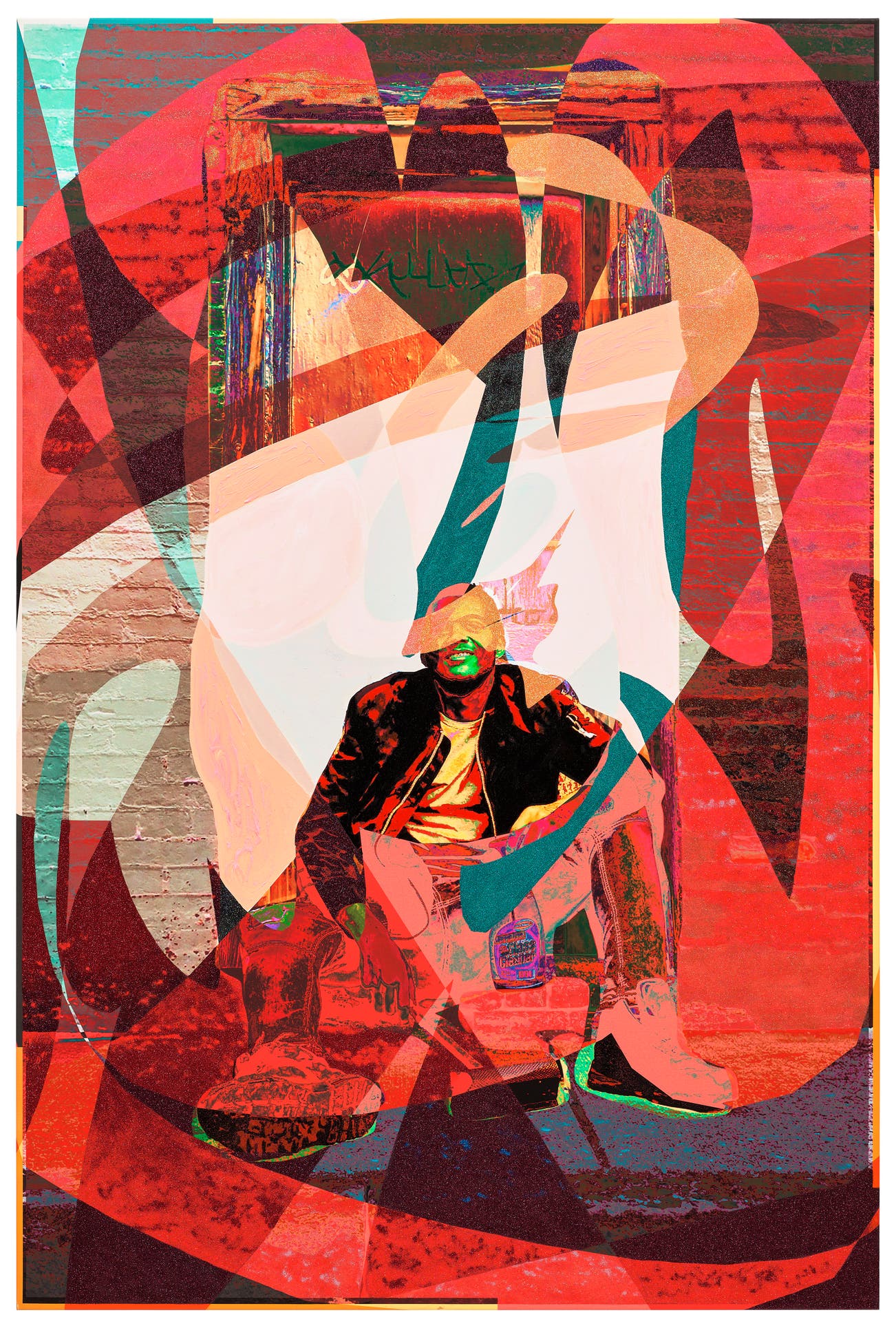 acrylic, pastel and glitter on digital print on canvas