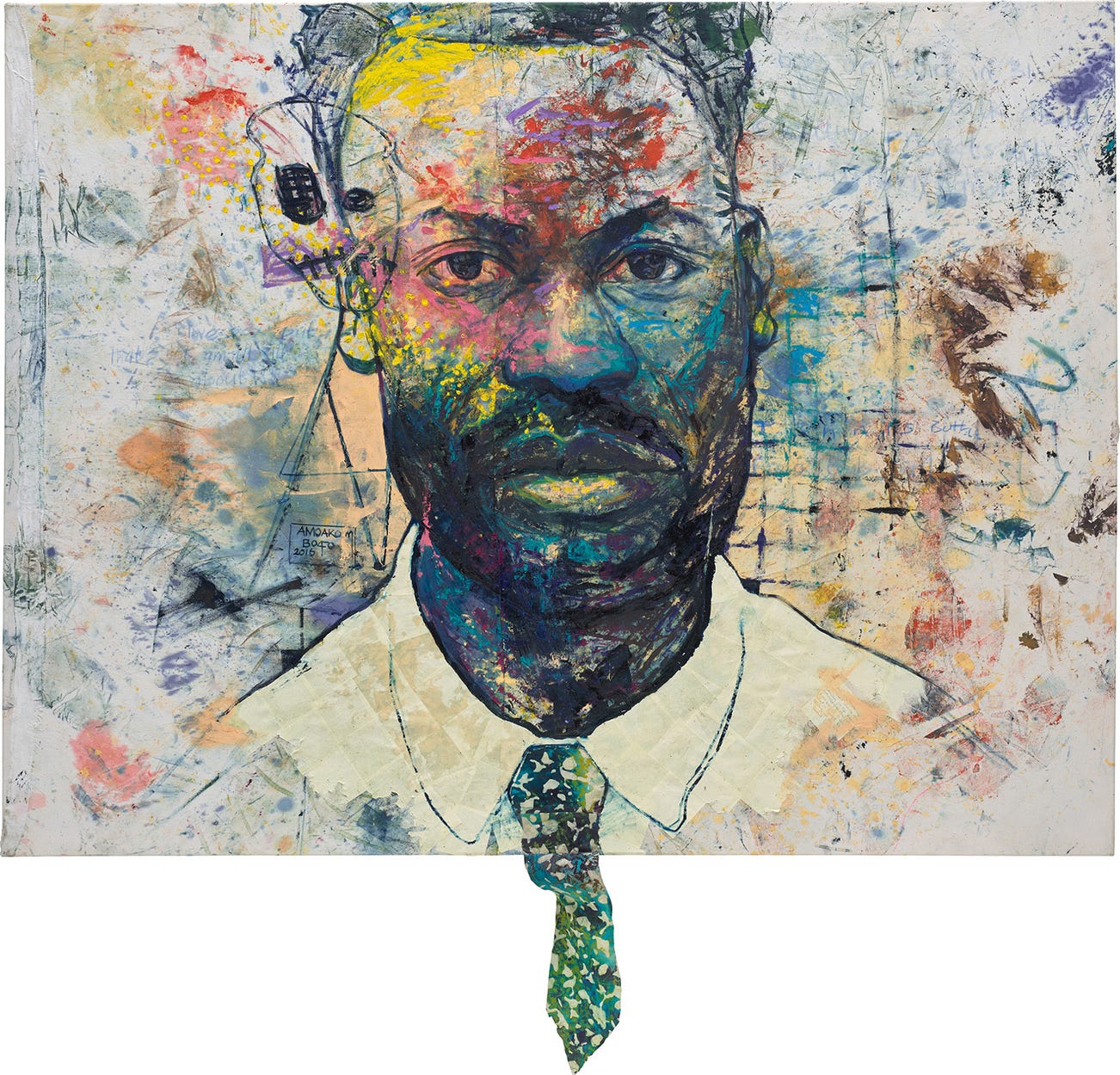 Boafo’s subjects and sitters importantly invite a celebration of their individual identity and a reflection on Blackness: "Most of the characters are people that share the same ideas as me. Others are also people that I find strength in—how they celebrate/live their blackness" (Amoako Boafo, quoted in Victoria L. Valentine, "Amoako Boafo’s First Exhibition at Roberts Projects in Los Angeles Centers Black Subjectivity," Culture Type, 15 February 2019, online). In the present work, Boafo constructs his composition and his face through layered and energetic strokes of oil and acrylic to build up his image which courses with vital energy.