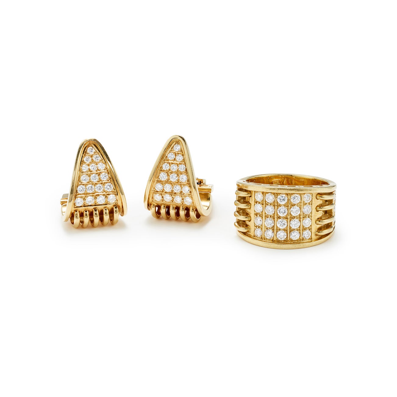 Comprising a pair of earrings and a ring.