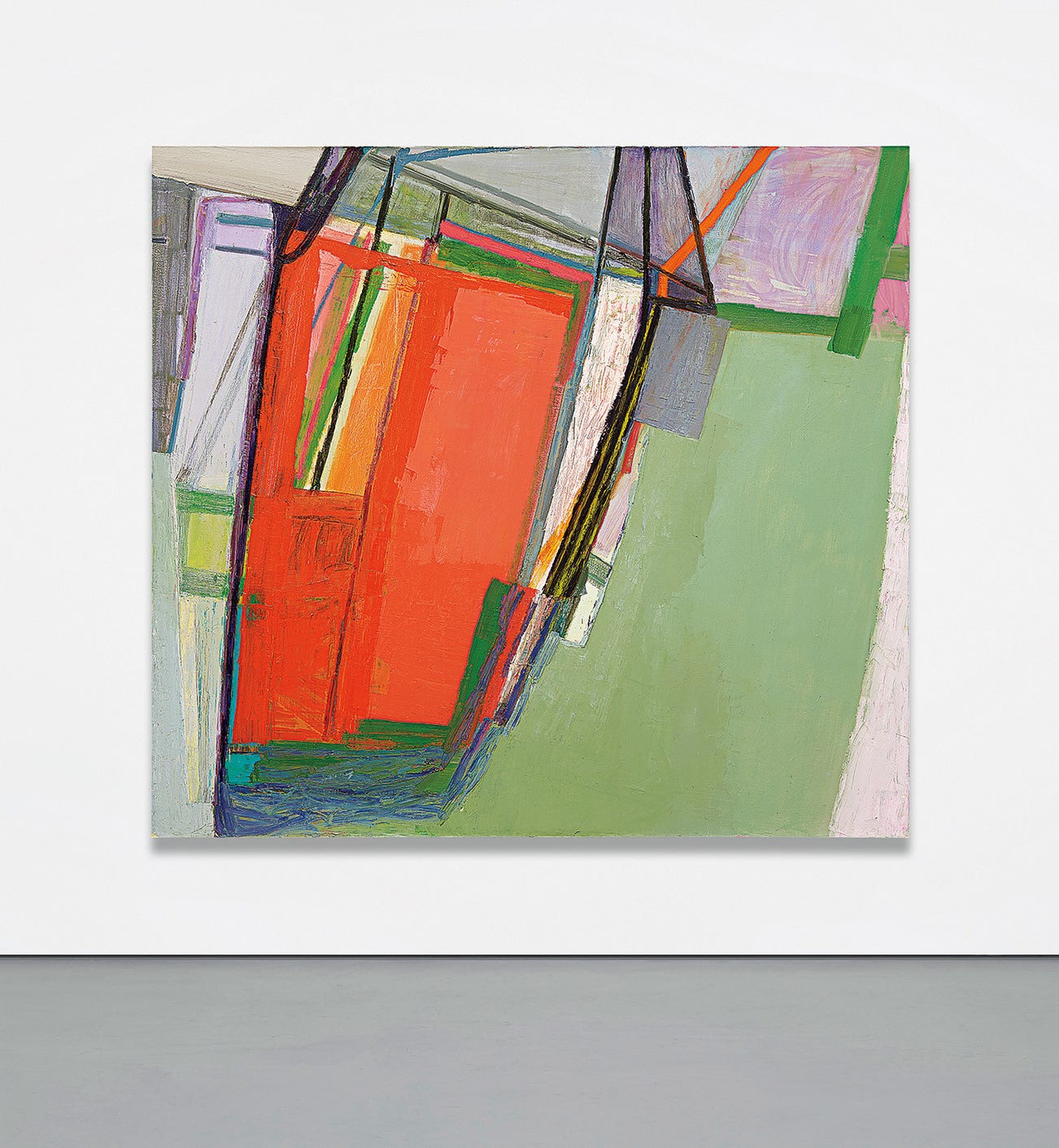 In the present work, geometric planes of lavender, fiery orange and greens are delineated by black impasto lines, reminiscent of Philip Guston’s organic forms made with dark contours. While Guston, who Sillman champions as one of her favorite painters, creates figures that are bound by connecting, bulbous shapes, Sillman breaks hers into fragments, separated by linear brushwork that simultaneously recall the geometric compositions of Richard Diebenkorn. Each of Sillman’s paintings is built in layers through a reductive process of erasing and reworking certain areas, which in turn creates a variety of textures. The tactile variations become the subjects of the paintings themselves, as heavy impasto forms appear to be in the foreground, while thinner expanses of color applied more uniformly recede into the background.