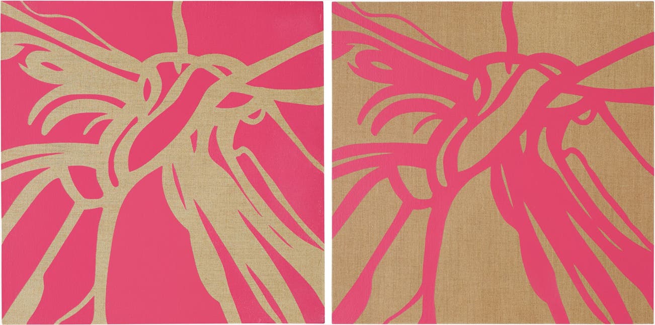 In the present lot Hoyos illustrates a simple, everyday form: a knotted bow tied around a young palenquera’s waist. She embraces this visual detail and expands the form with pink and gold pop colors to highlight the complex folds and gathers of the knotted ribbon. Through her use of acrylic paint she draws the contours of her motifs, attaining abstractions of such elements through her choice of composition, while maintaining the representative vibrancy of the colors of the clothes. These graceful images emphasize the folds as signs of gallantry, vanity and coquettishness. Furthermore, they also refer metaphorically to social mechanisms of control over the female body, the knot being a gesture of restraint that alludes to the memory of a community that, for over a hundred years, faced the abuses of slavery.