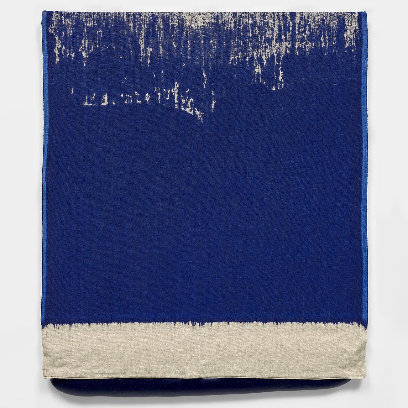 "[The] series, titled Pressed Paint, is a perfect example of the artist’s exploration of the basic building blocks of the artistic vernacular, and sheds light on the essential definitions of painting, sculpture and printmaking. To create this series, Saban first crafted a pillowcase-like sack out of unprimed linen and filled it with one half-gallon of acrylic paint. The pregnant bag was then squeezed through the printing press just far enough so that a thick layer of paint spilled out of the open side. Mounted on the wall, the five versions (cadmium red, ultramarine blue, middle gray, titanium white and mars black) appear frozen in time. Streaks of color saturate the fabric in a cascading pattern, while the paint, peeking out of the bottom of the bag, provides evidence of the process. Not only is this 'printed edition' both a sculpture and a painting, it is an artwork that draws our attention to the inside of the object, not just the surface." - Gemini G.E.L., Los Angeles, Analia Saban – Where We Start From, Press Release, 2018