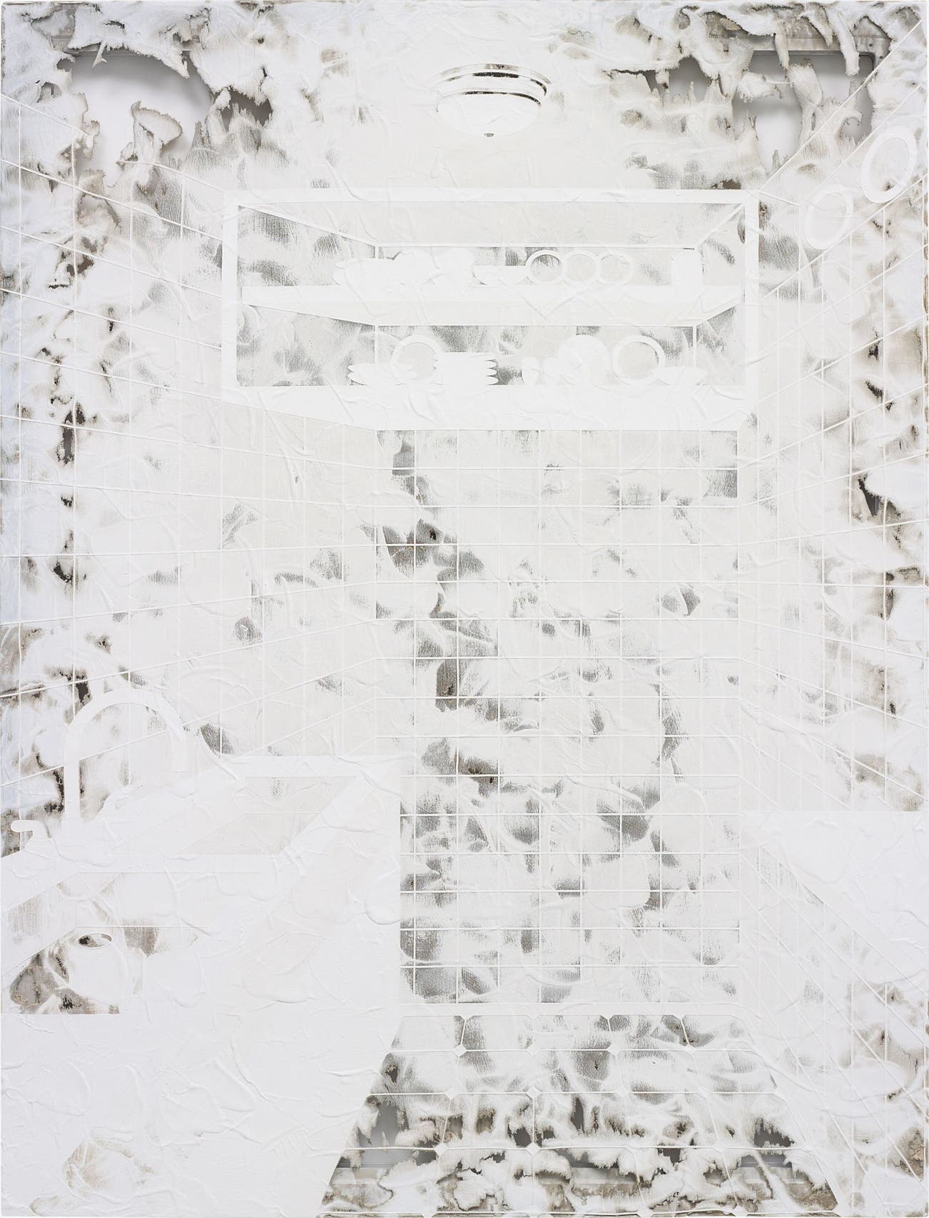 Argentinean-born Analia Saban reinterprets traditional painting convention as she explores the results of her own trial and error. In Erosion (Kitchen), Saban simultaneously breaks apart and reconstructs the picture plane, blurring the lines between painting and sculpture. The soft muted tones of the canvas converge with the harsh planar geometry of the laser-cut acrylic, creating a feeling of quiet displacement in an otherwise inviting interior. Through this play with space and method, Saban transforms architectural studies into rich inquiries into her own psyche.