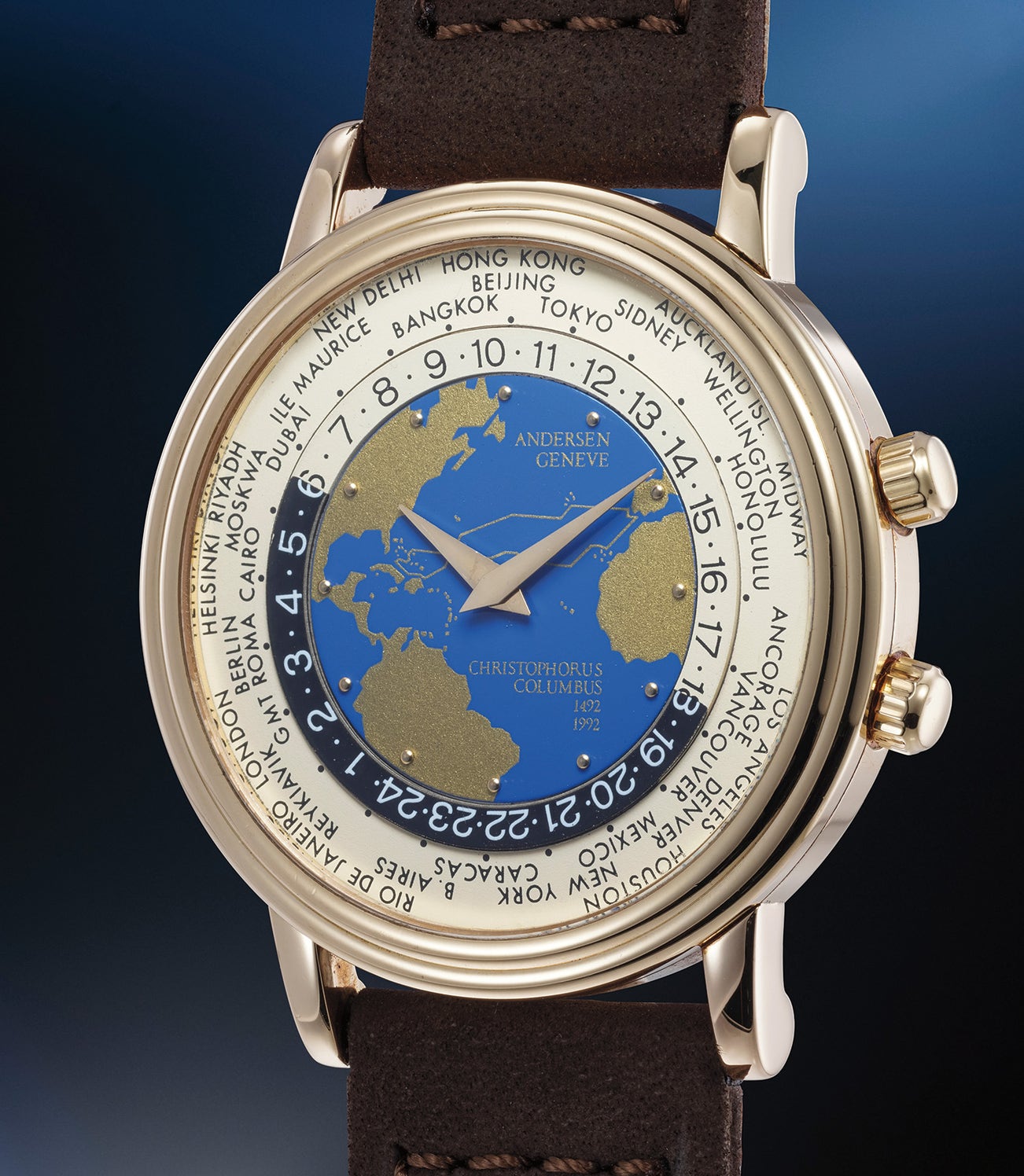 Originally launched in 1992, The Andersen world time "Christopher Columbus" is the second iteration of wristwatches made by the eponymous Sven Andersen. Released to commemorate the 500 years since the intrepid voyage made by Columbus in 1492, the world time was released as a limited edition of 500 pieces, made exclusively in yellow or pink gold.