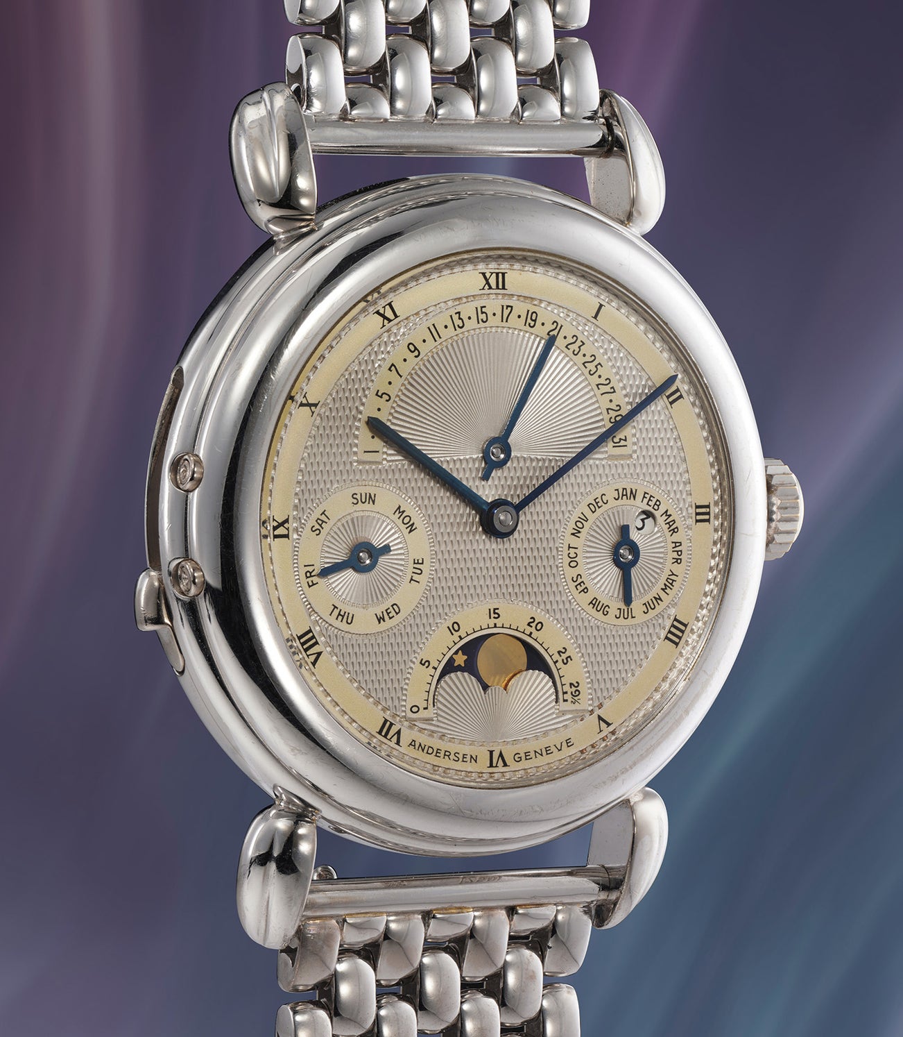 Andersen had made a handful of wristwatches featuring a minute repeater with retrograde perpetual calendar but each with a different dial and case design making the present example truly unique.